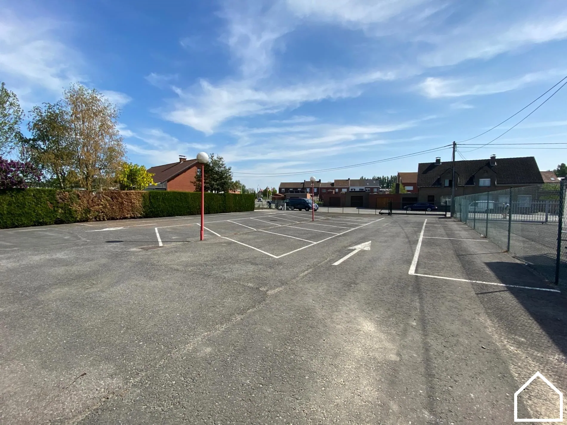 Het perceel is afgesloten met een automatische schuifpoort. De oppervlakte van de parking bedraagt 800m² en is goed voor minimum 20 parkeerplaatsen.
