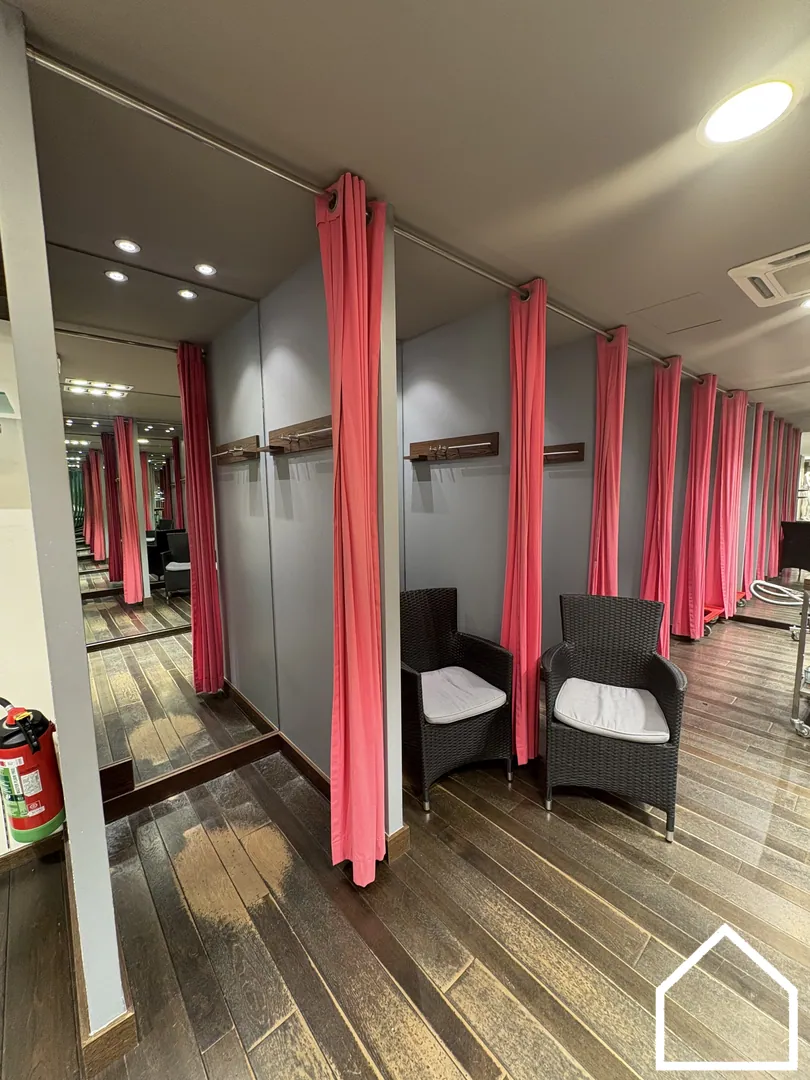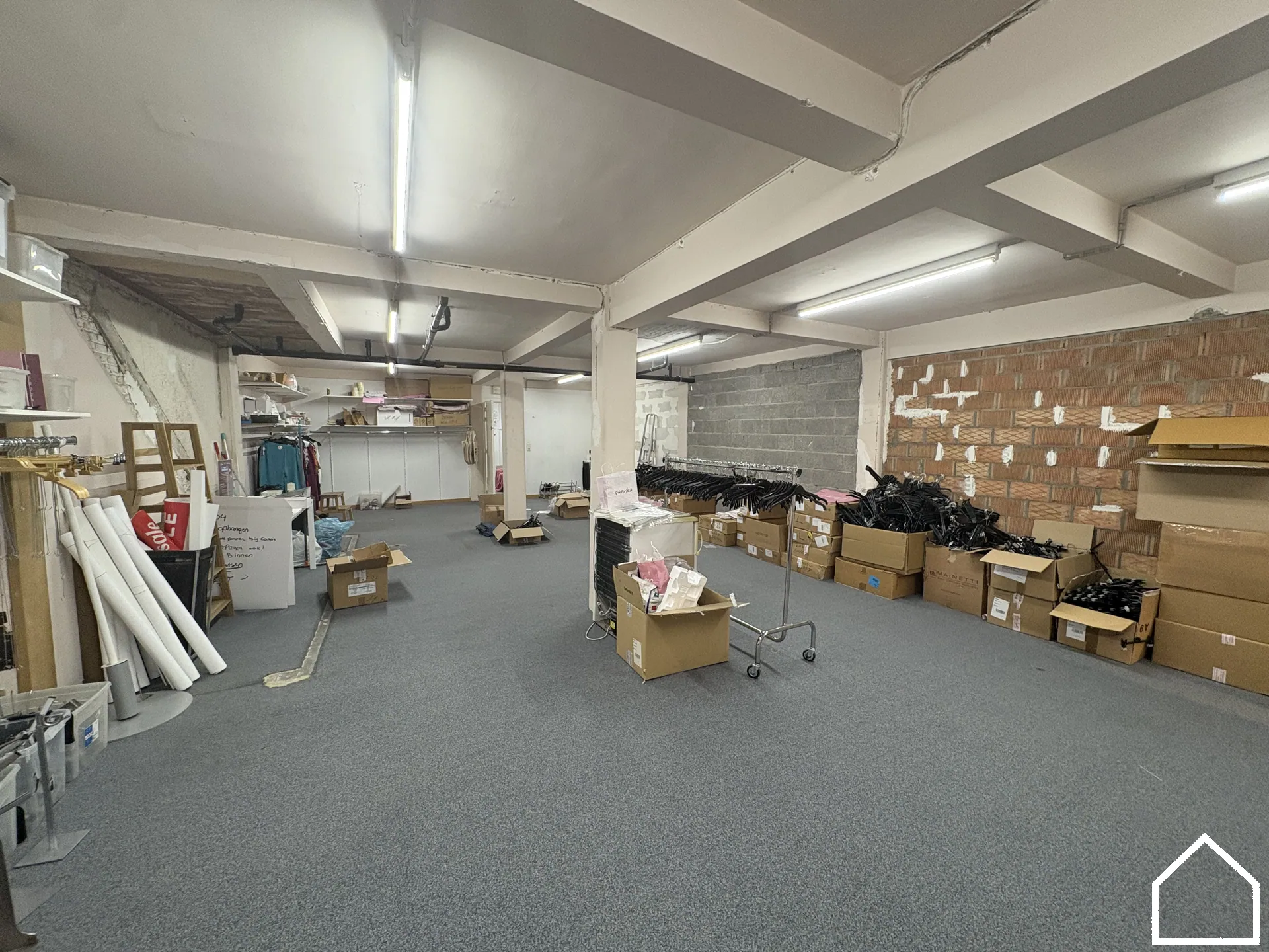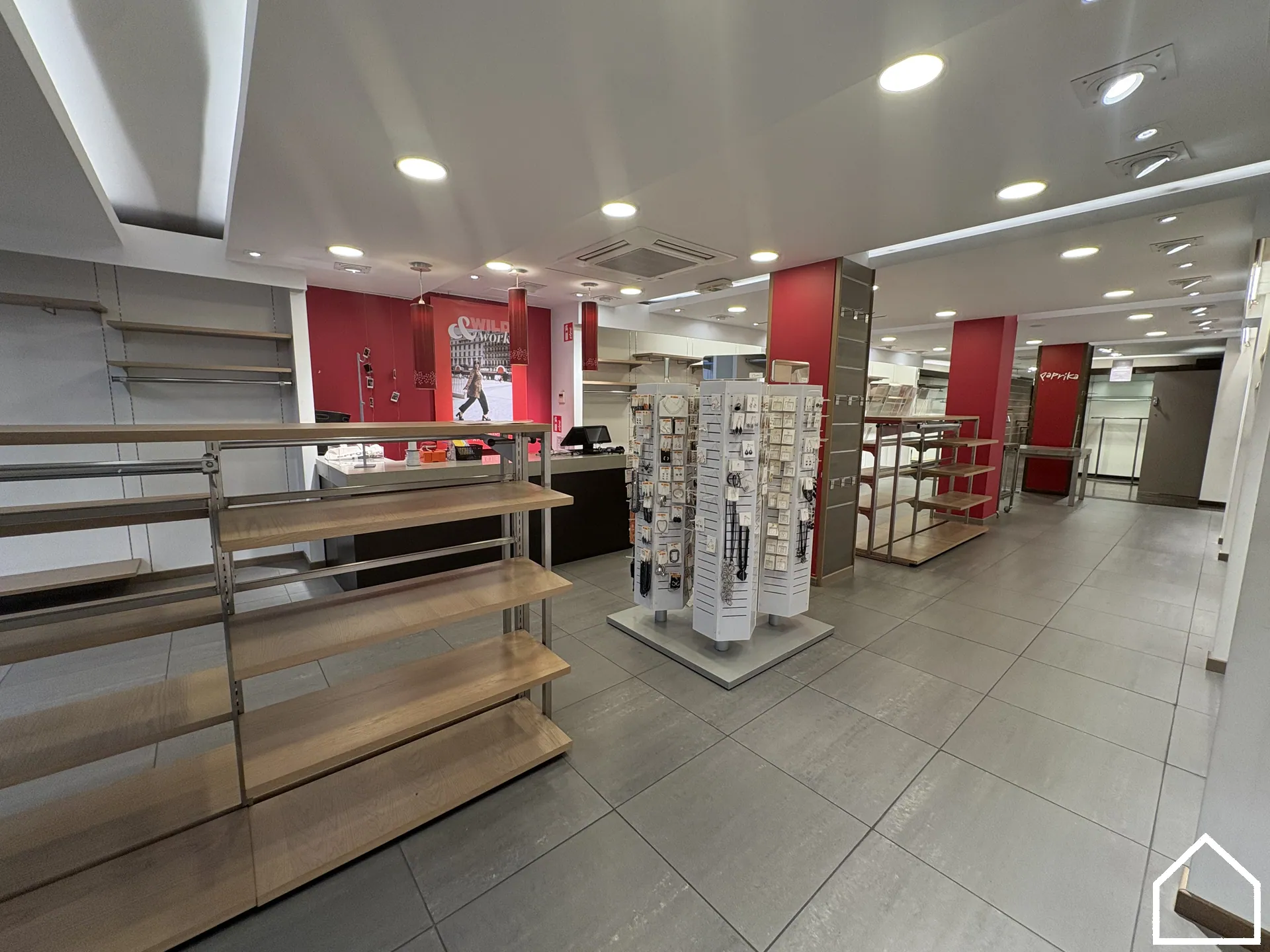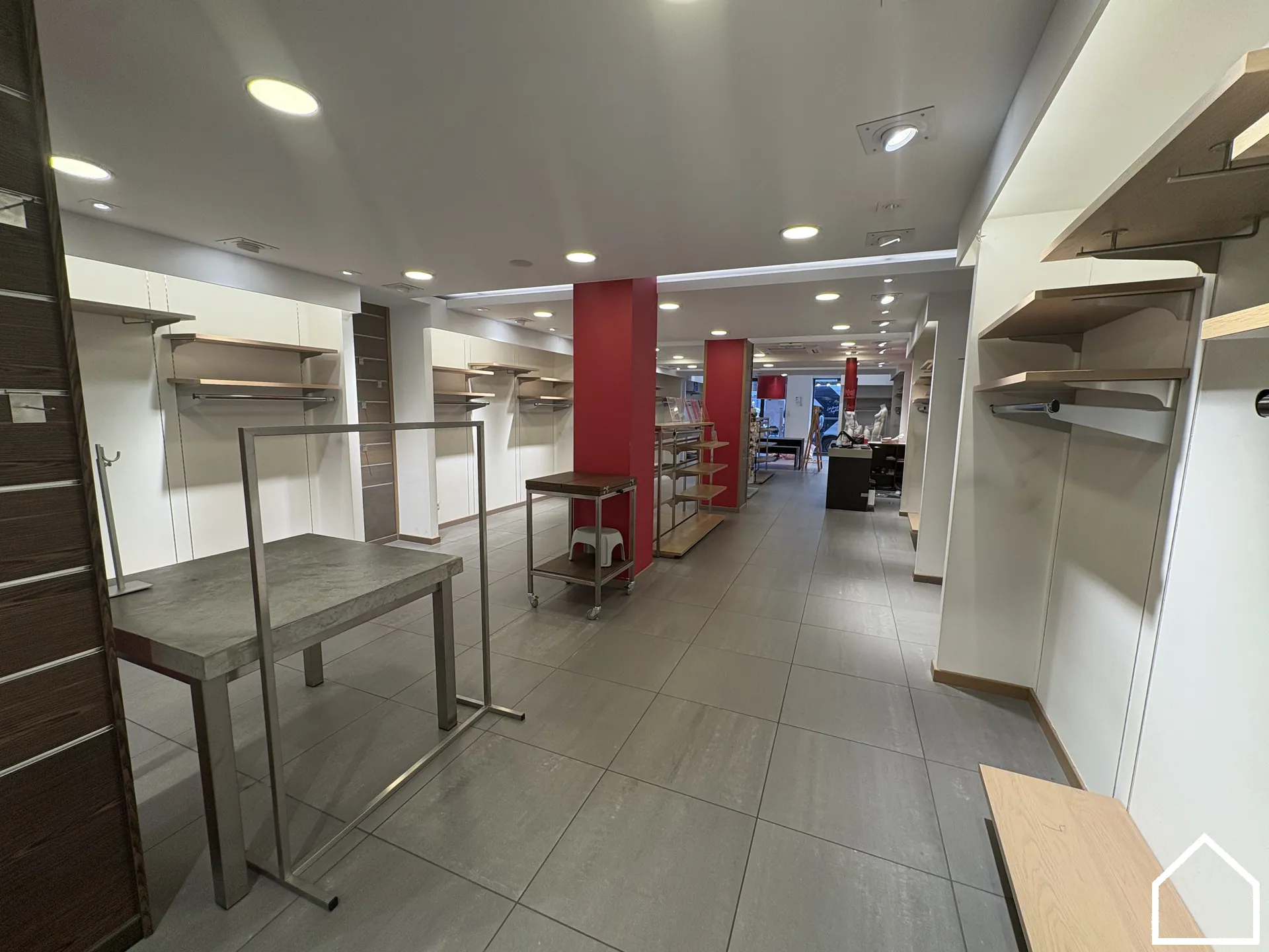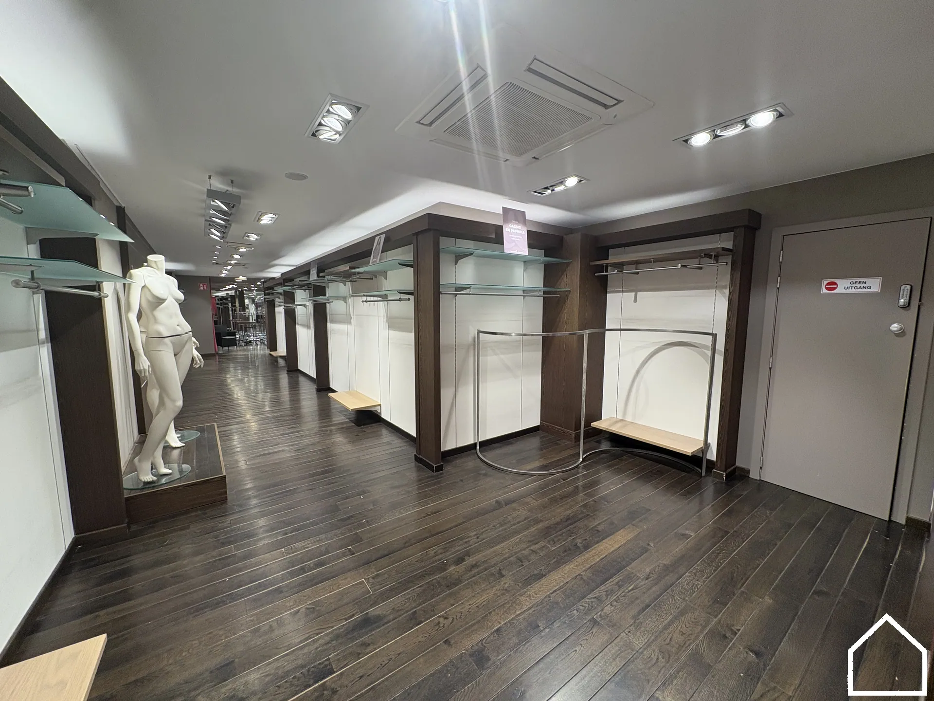 De winkelruimte biedt een uitstekende visibiliteit en is praktisch ingedeeld, met achteraan paskamers.