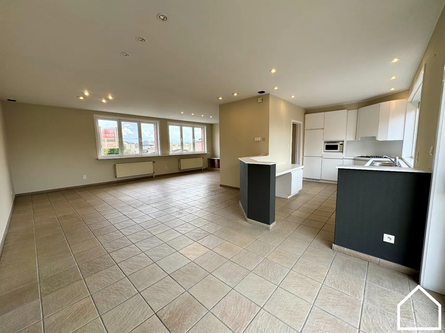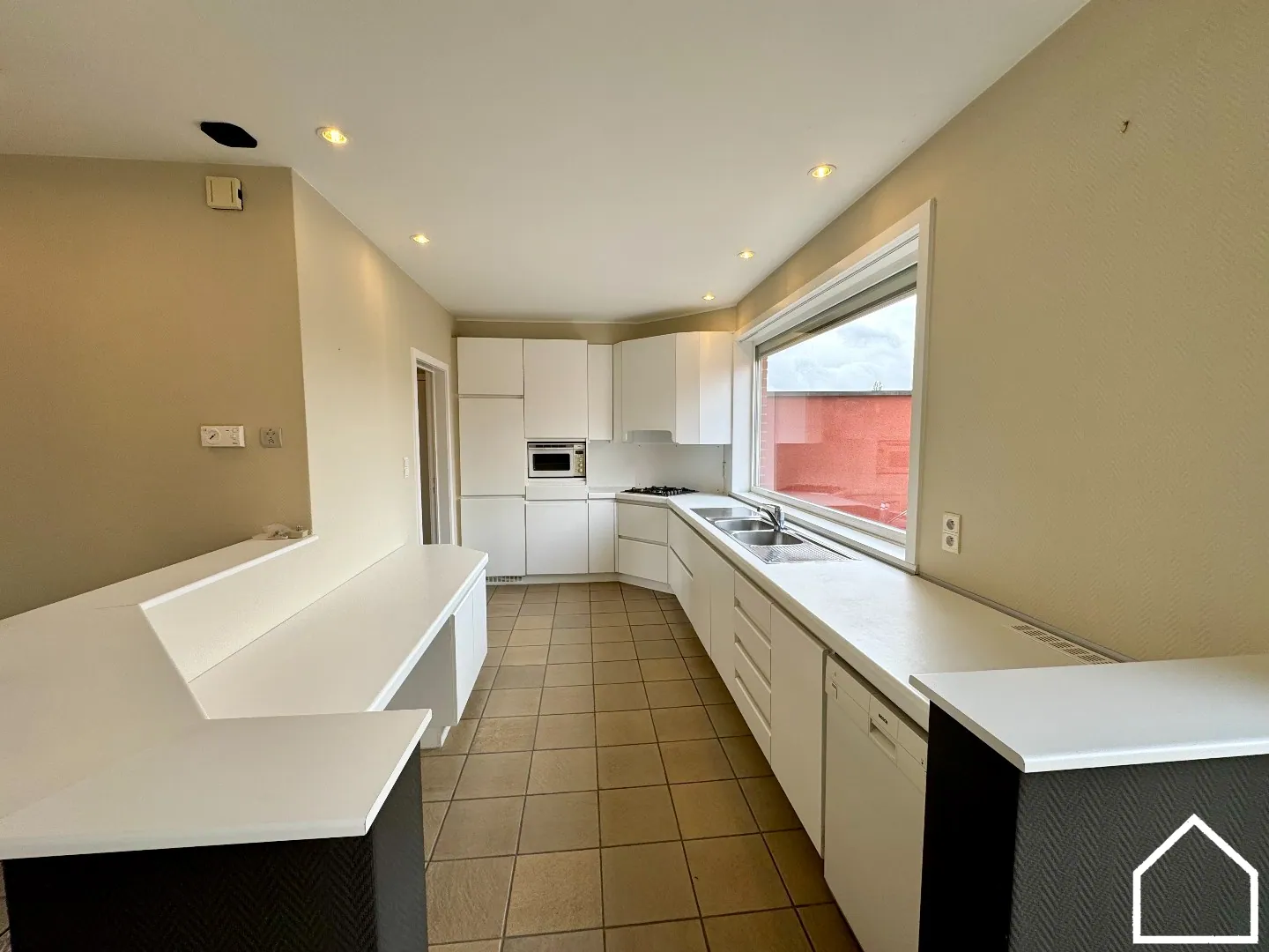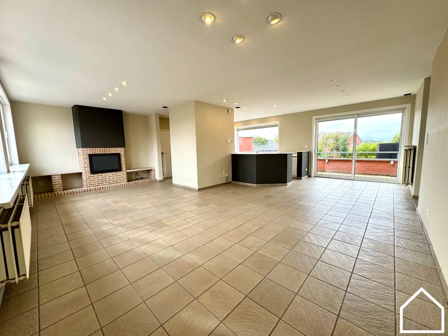 Verhuurd appartement linksboven bestaande uit een ruime living met open ingerichte keuken met vaatwas, kookplaat op aardgas en frigo (58m²) - terras (31m²) - apart toilet met lavabo - berging (3m²) - badkamer met ligbad, douchecel en dubbel lavabomeubel (9m²) - 2 slaapkamers waarvan 1 met inbouwkasten (16.50m² - 16m²) - garage (21m²)