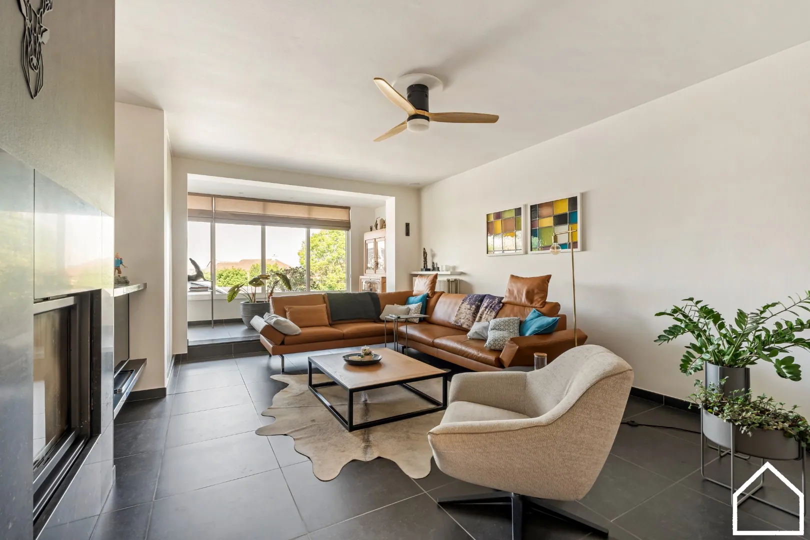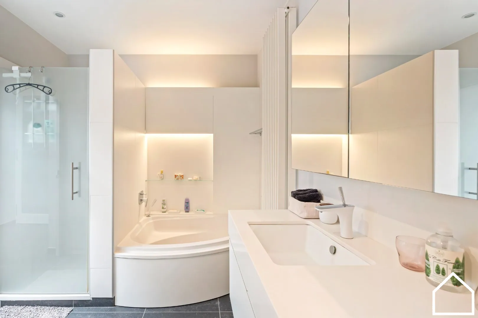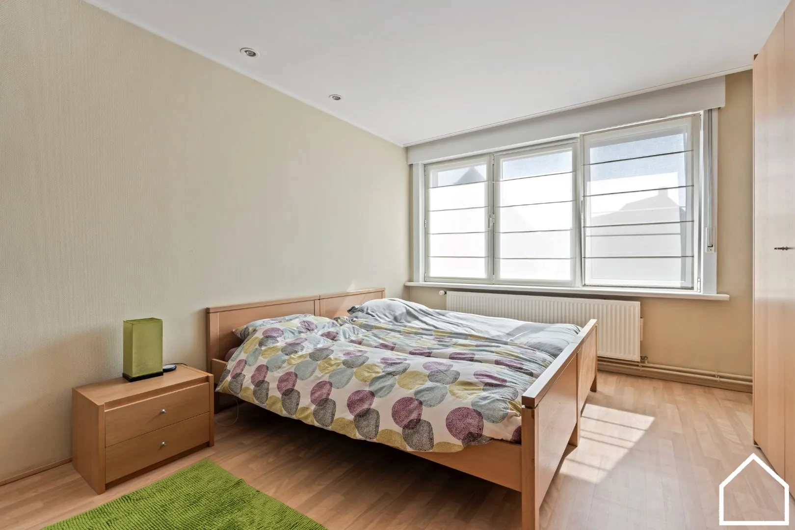 Verhuurd appartement linksboven bestaande uit een ruime living met open ingerichte keuken met vaatwas, kookplaat op aardgas en frigo (58m²) - terras (31m²) - apart toilet met lavabo - berging (3m²) - badkamer met ligbad, douchecel en dubbel lavabomeubel (9m²) - 2 slaapkamers waarvan 1 met inbouwkasten (16.50m² - 16m²) - garage (21m²)