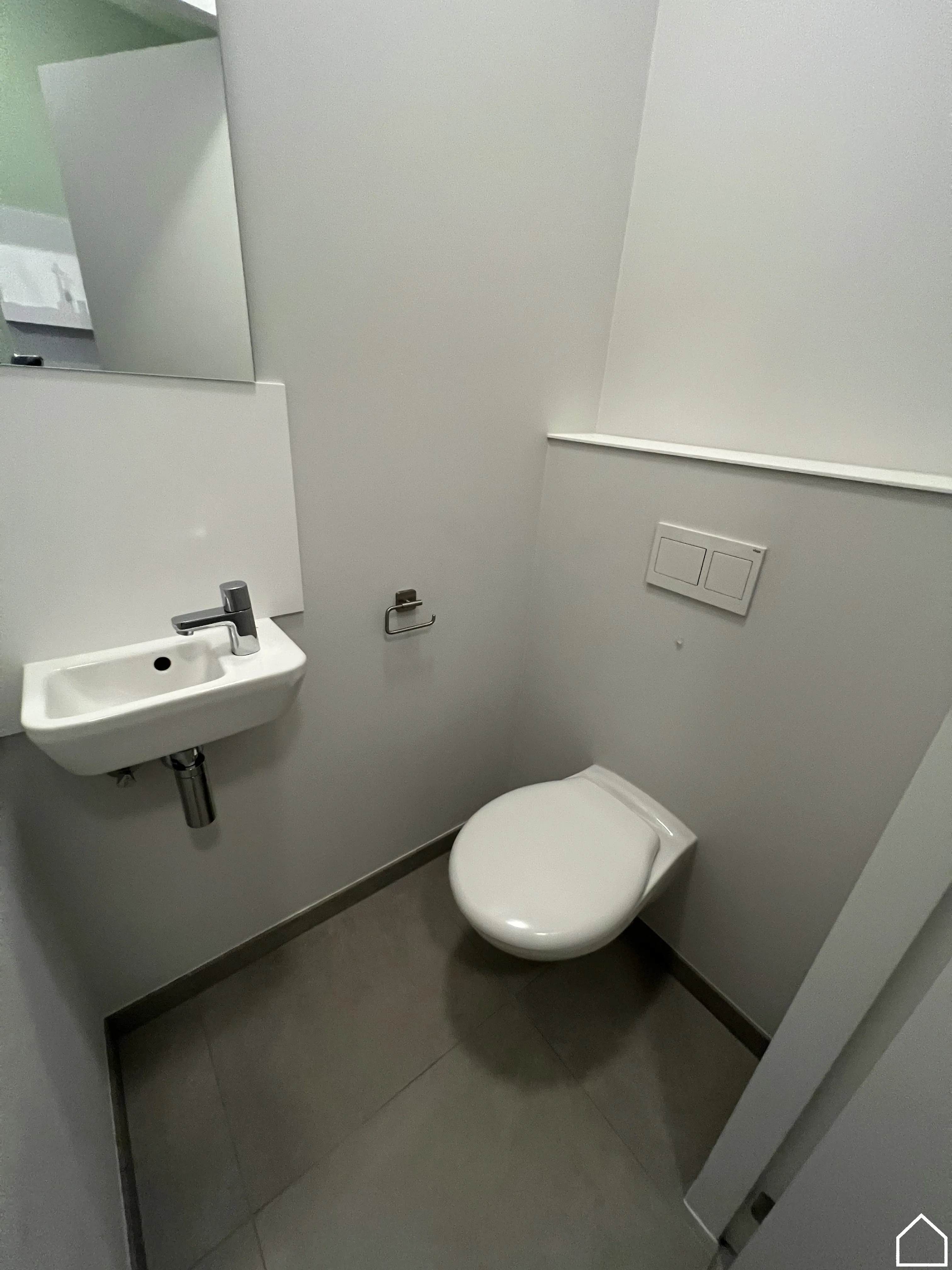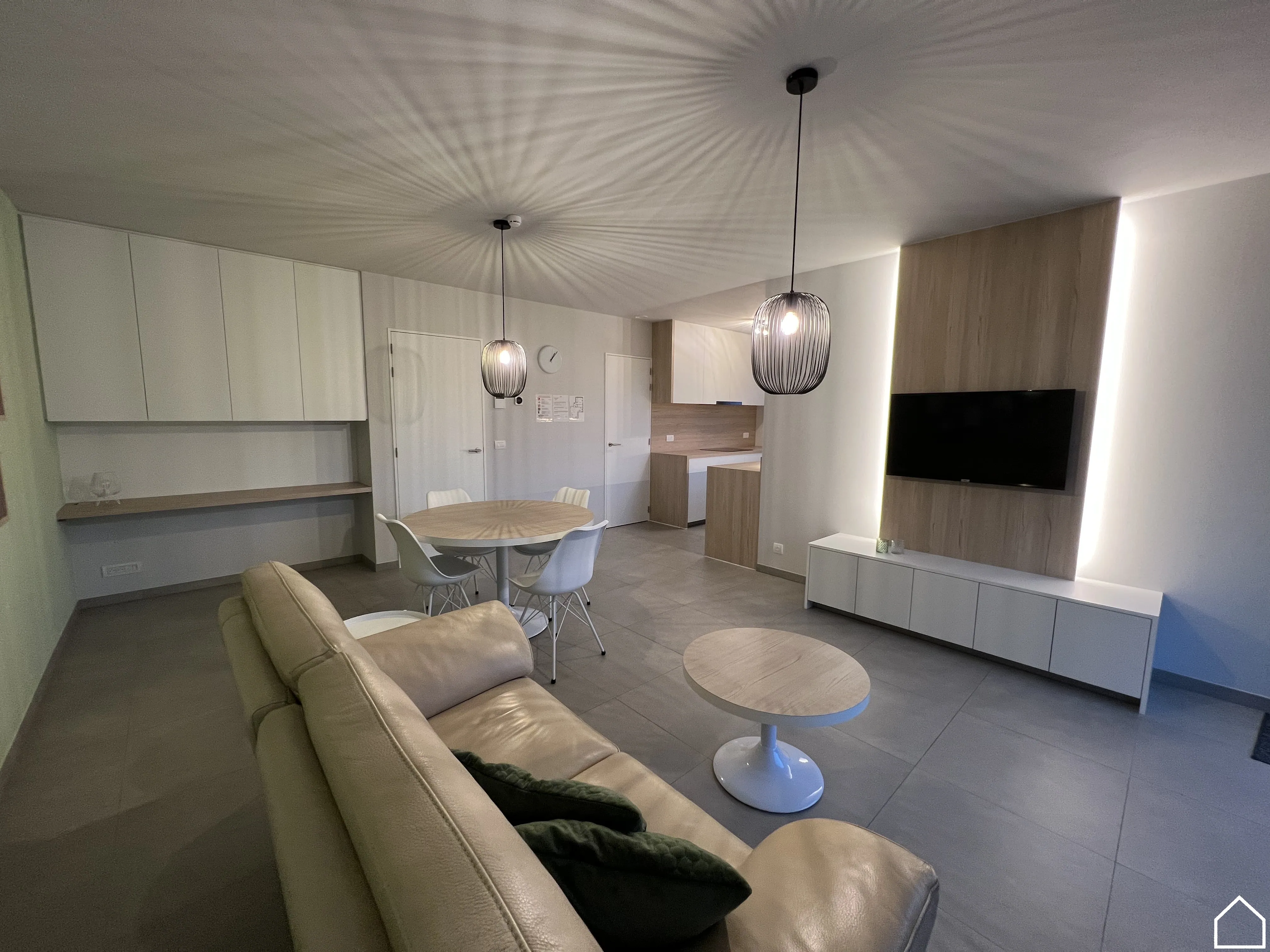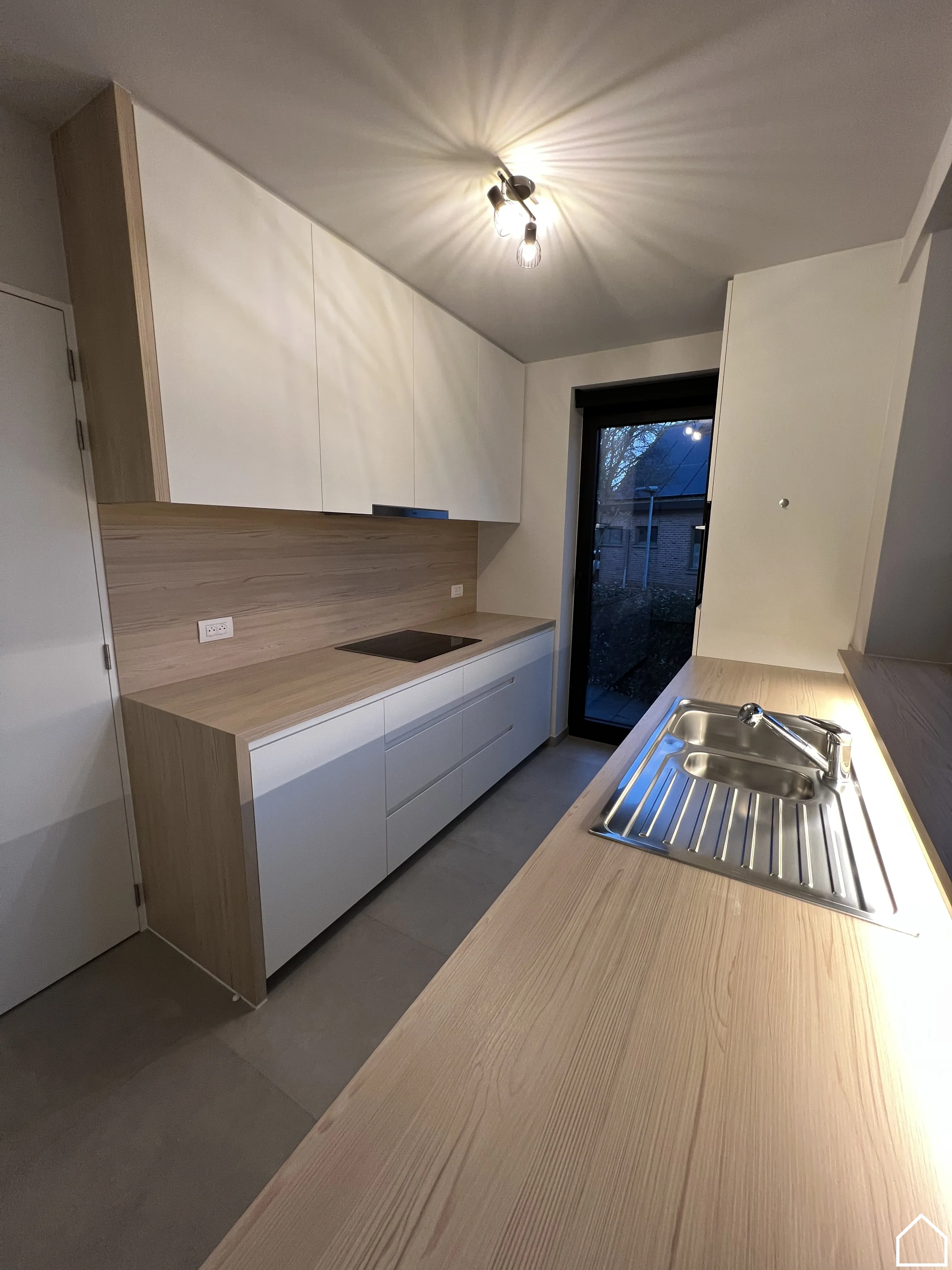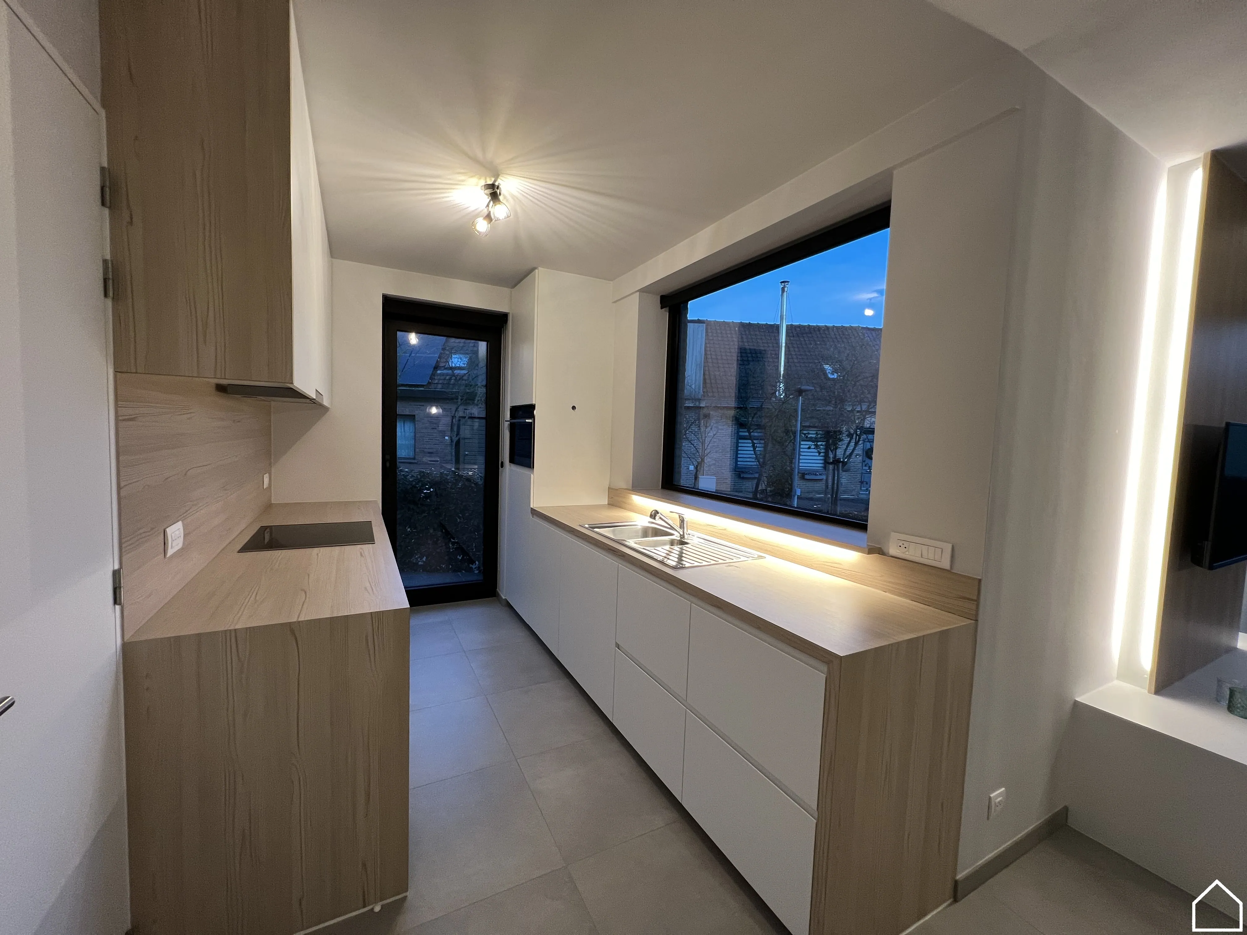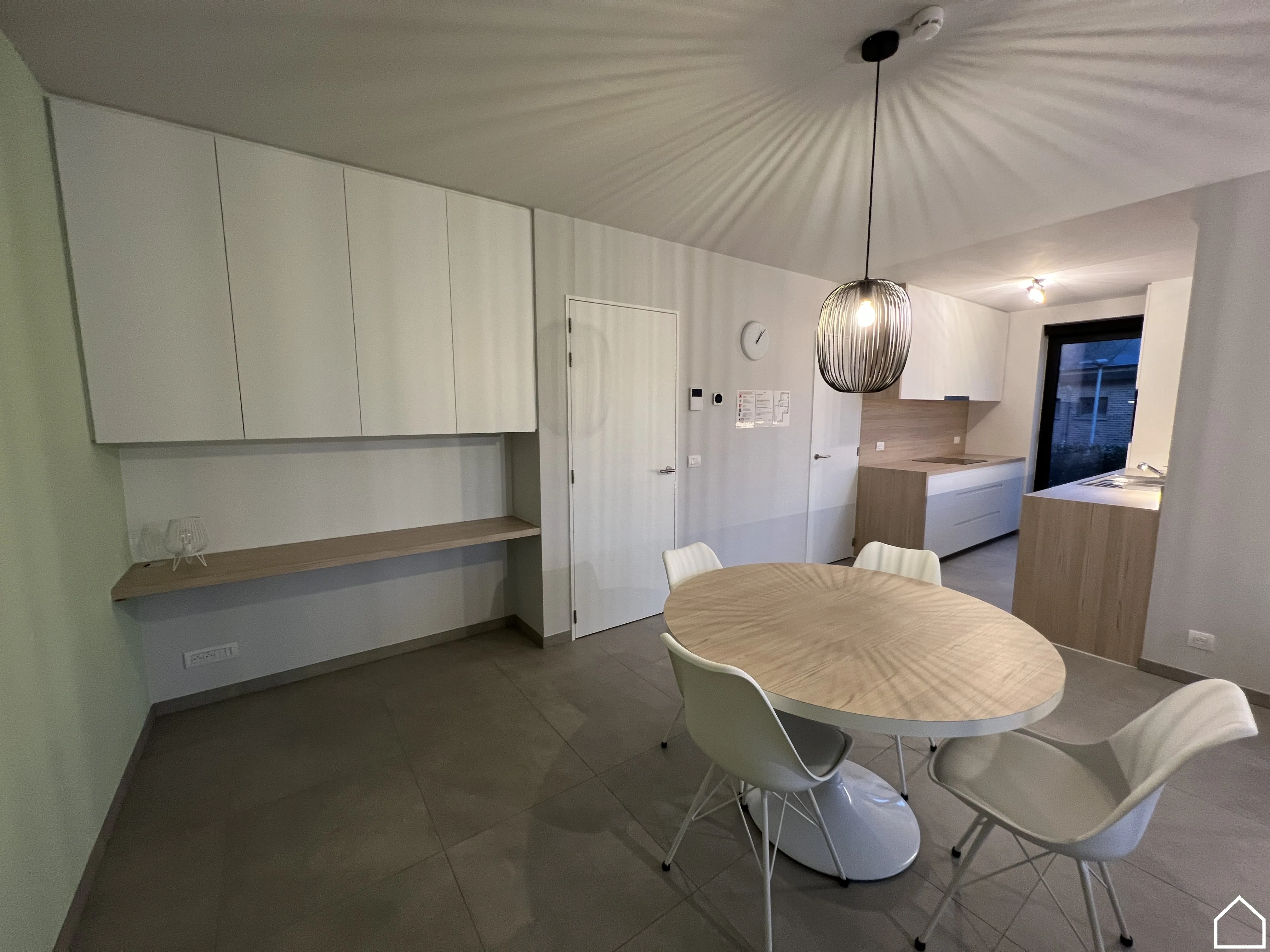 Je komt binnen via de inkomhal met apart toilet, waarna je doorloopt naar de lichtrijke leefruimte met open, uitgeruste keuken. Alle toestellen zijn aanwezig, met uitzondering van een vaatwas. Aansluitend bevindt zich een handige bureauruimte, perfect voor thuiswerk of studie.