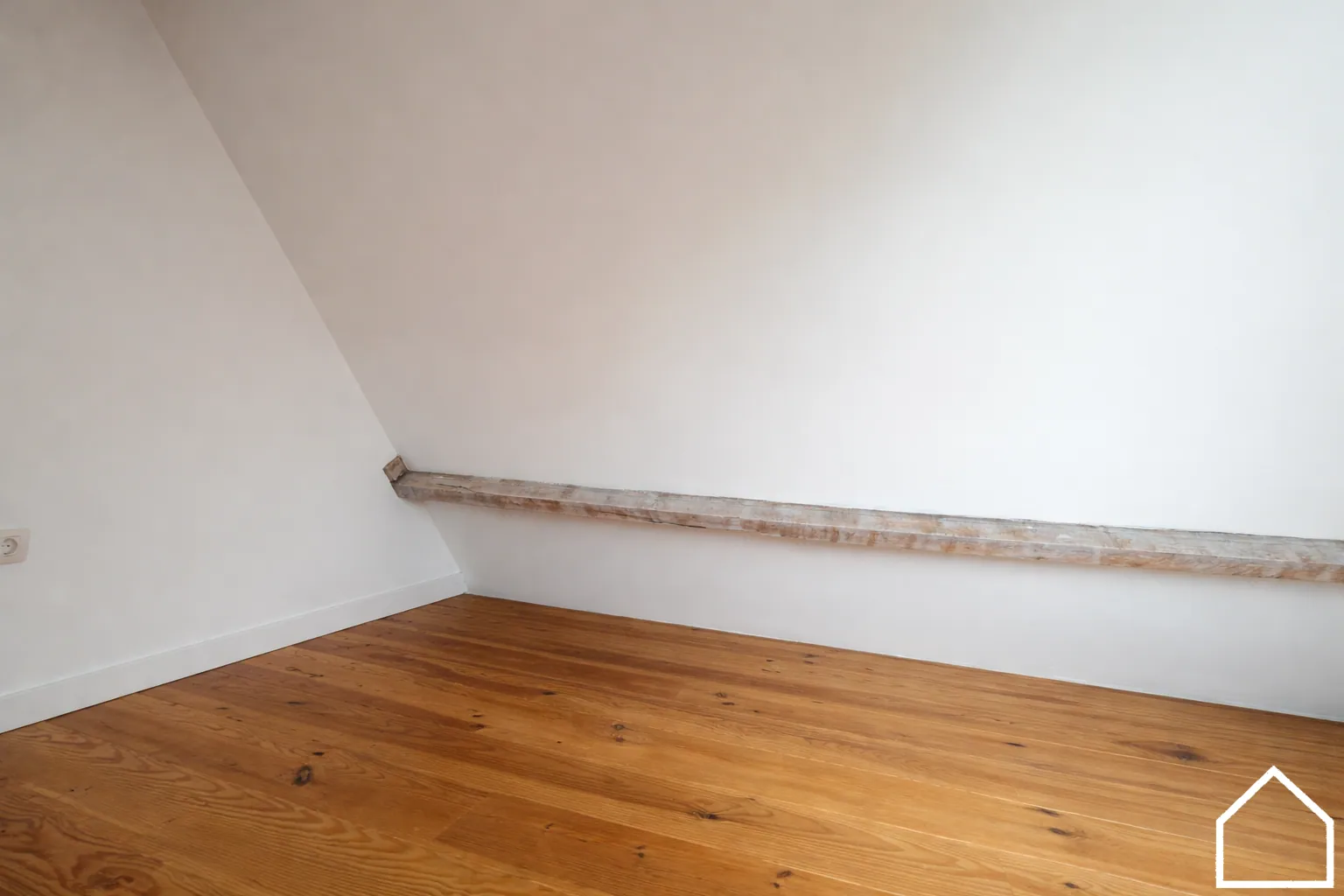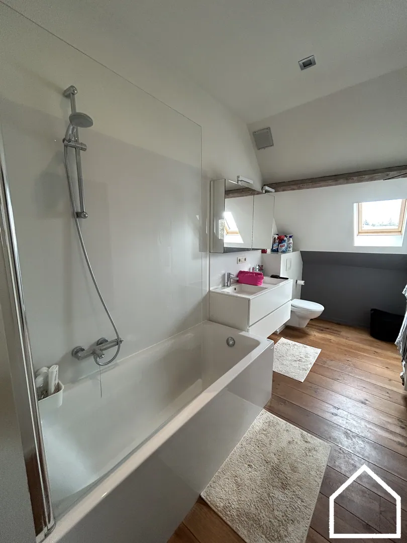 1e verdieping: twee slaapkamers (waarvan één toegang geeft tot een extra opbergruimte op het tweede verdiep), badkamer uitgerust met douche/bad, dubbele lavabo met lavabomeubel en toilet.