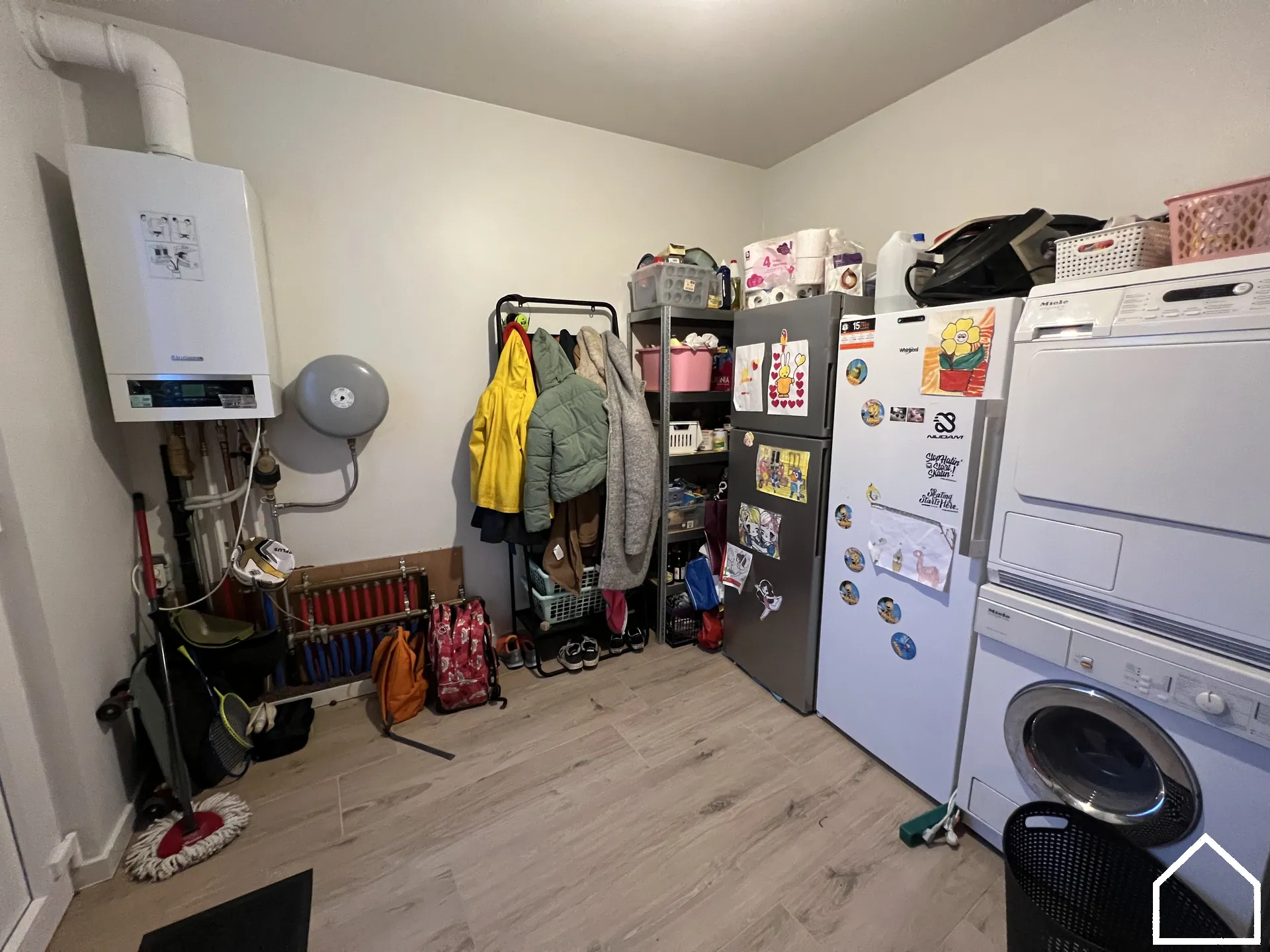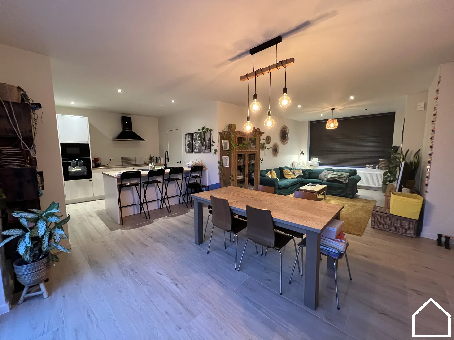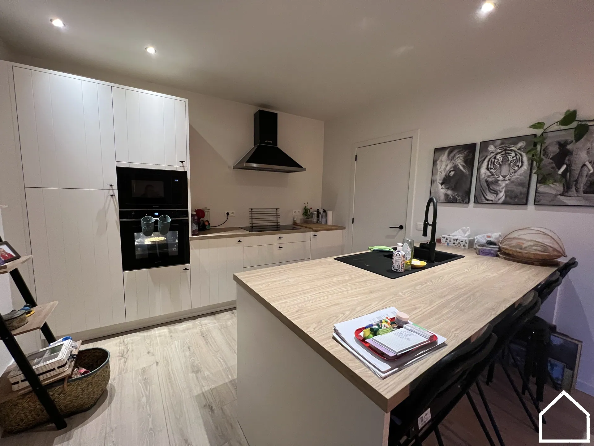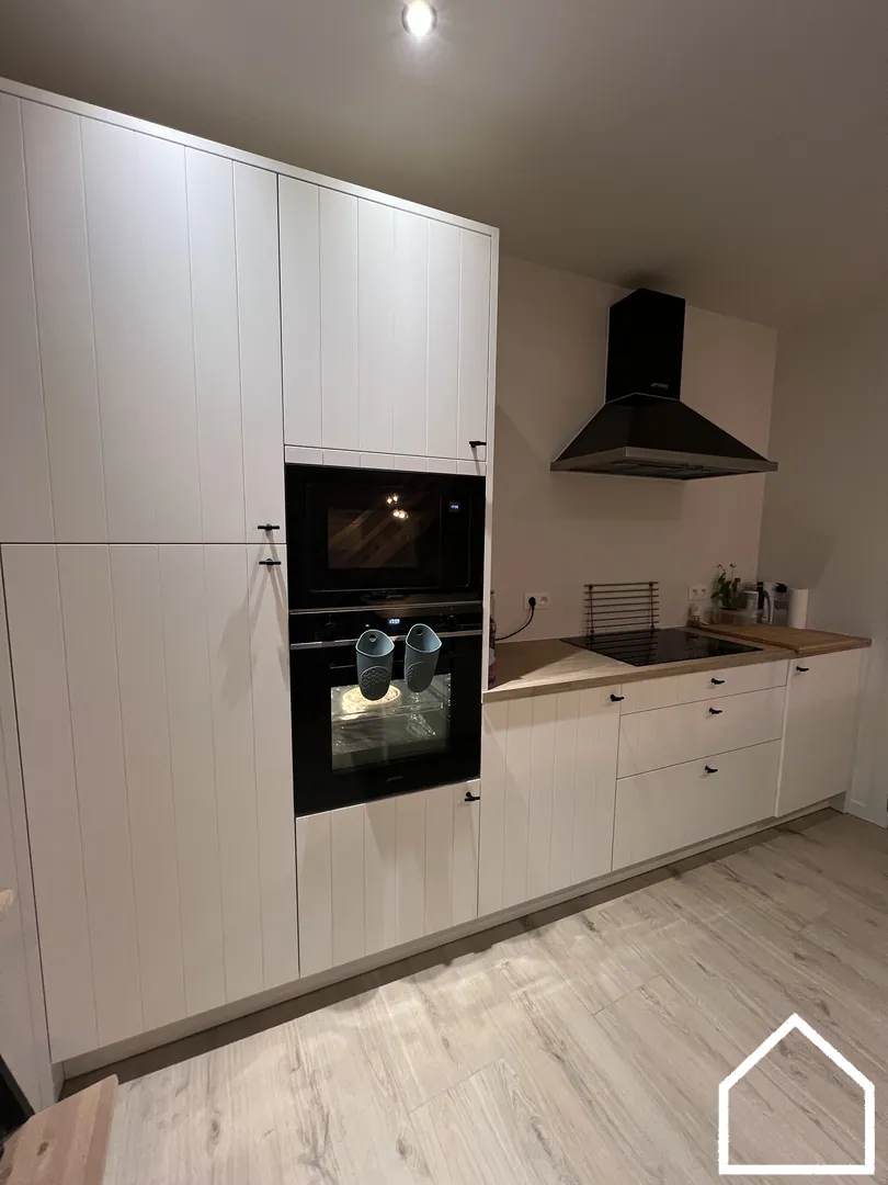Via de inkomhal betreedt u de ruime, lichtrijke leefruimte waar gezelligheid en comfort centraal staan. De open, volledig uitgeruste keuken vormt het hart van de woning en is uitgerust met kwalitatieve SMEG-toestellen: vaatwasser, microgolf, heteluchtoven, inductiekookplaat en koelkast. Aansluitend bevindt zich een praktische berging/wasruimte die zorgt voor extra opbergruimte en gebruiksgemak.