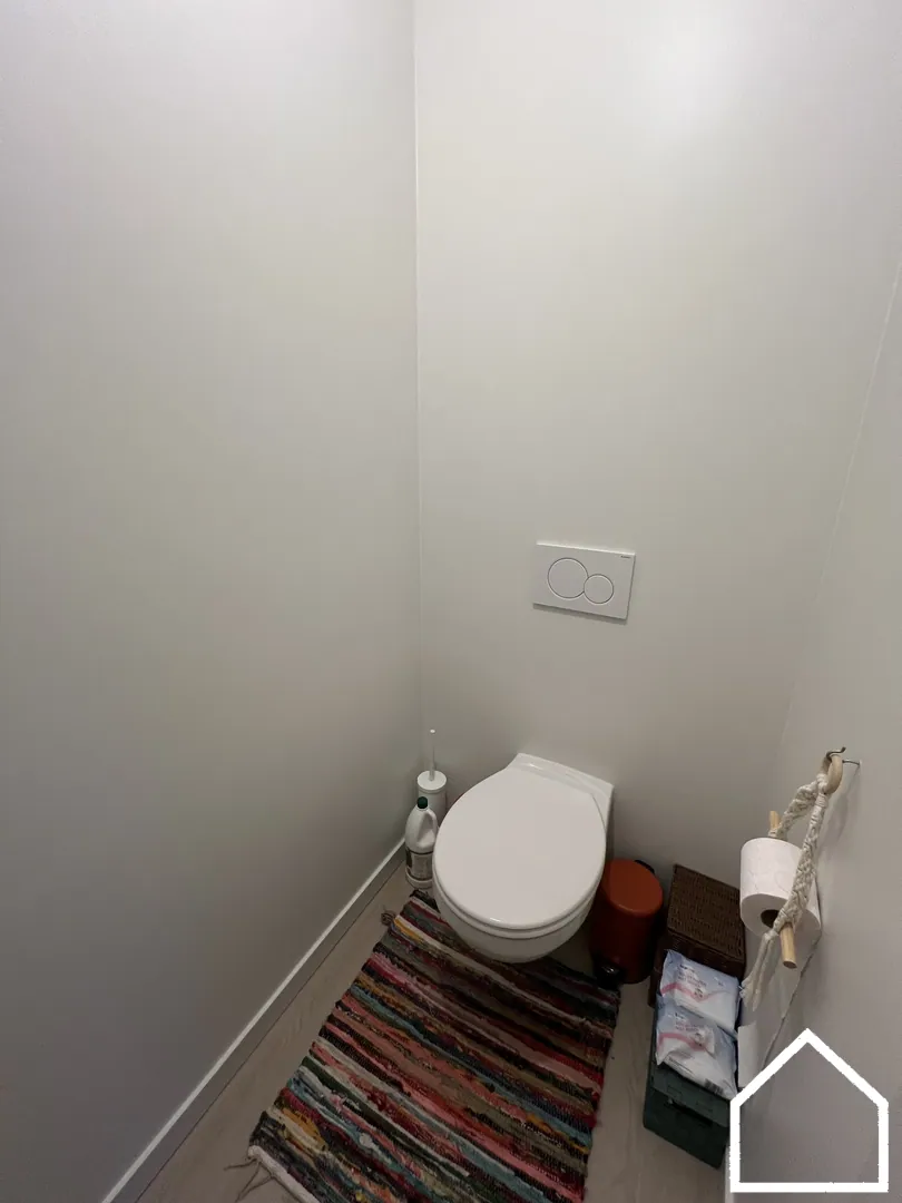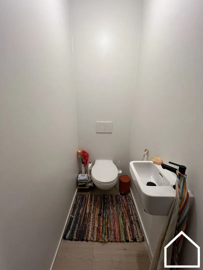 Op het gelijkvloers vindt u daarnaast een apart gastentoilet en een garage met elektrische sectionale poort — comfortabel en veilig parkeren gegarandeerd.