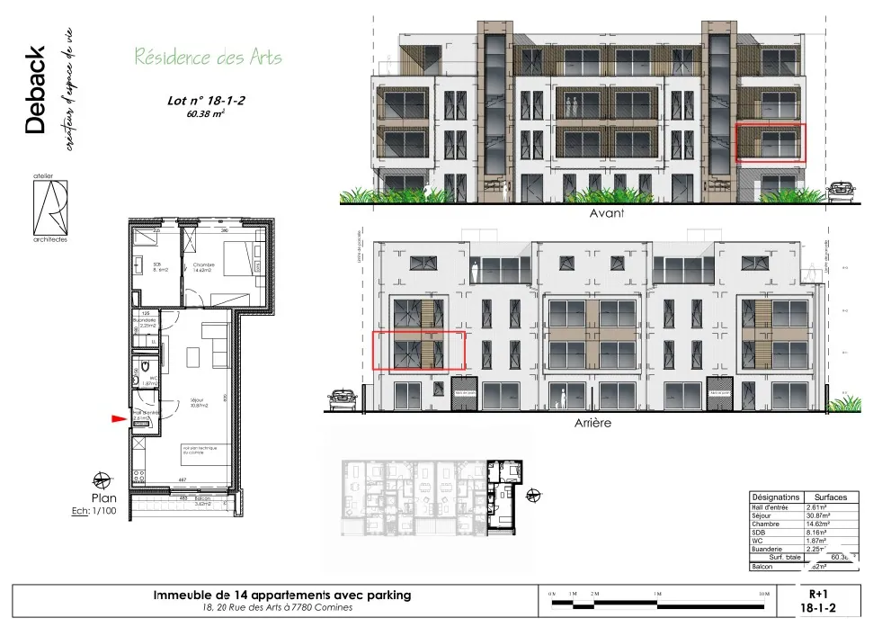 Dit nieuwbouwappartement op de 1e verdieping (62m²) bestaande uit een inkomhal met vestiaire en toilet, woonkamer met balkon en ingerichte keuken, 1 slaapkamer, wasruimte en douchekamer met wastafel.