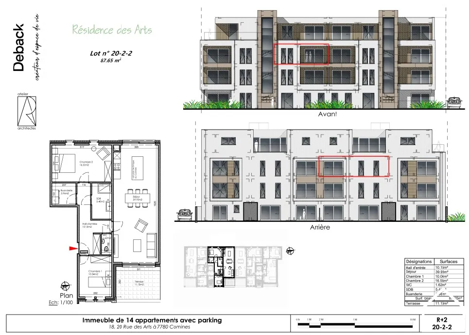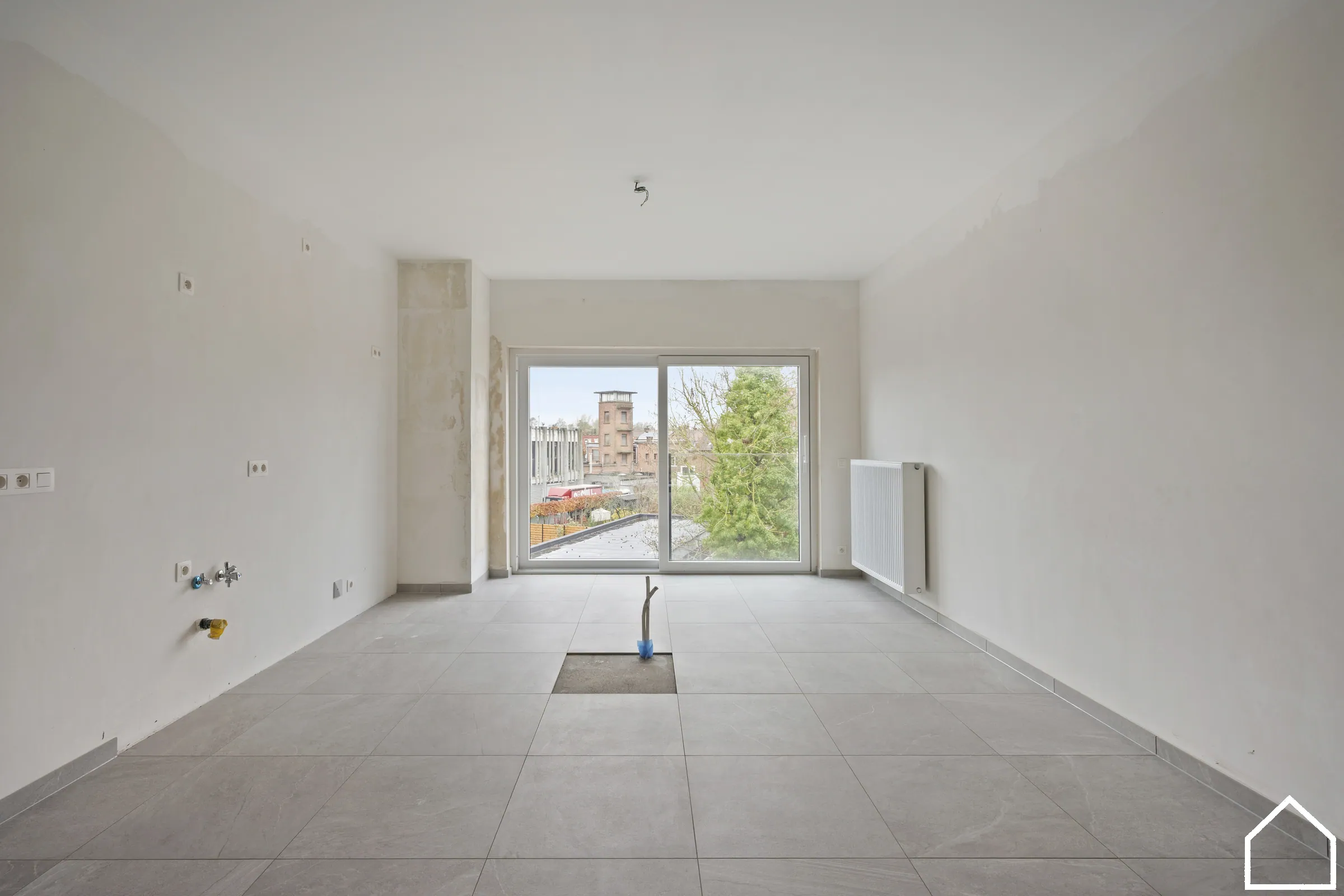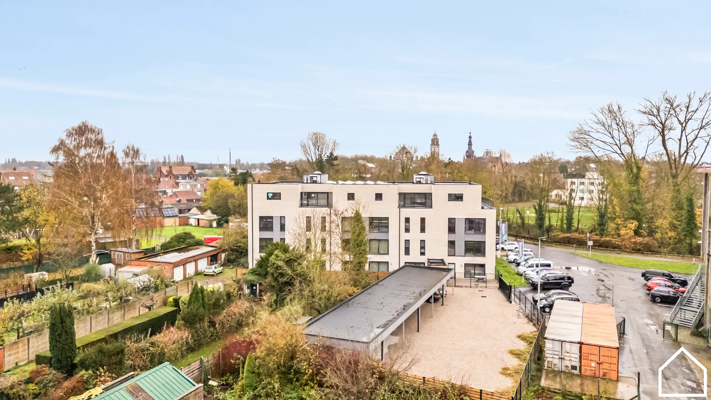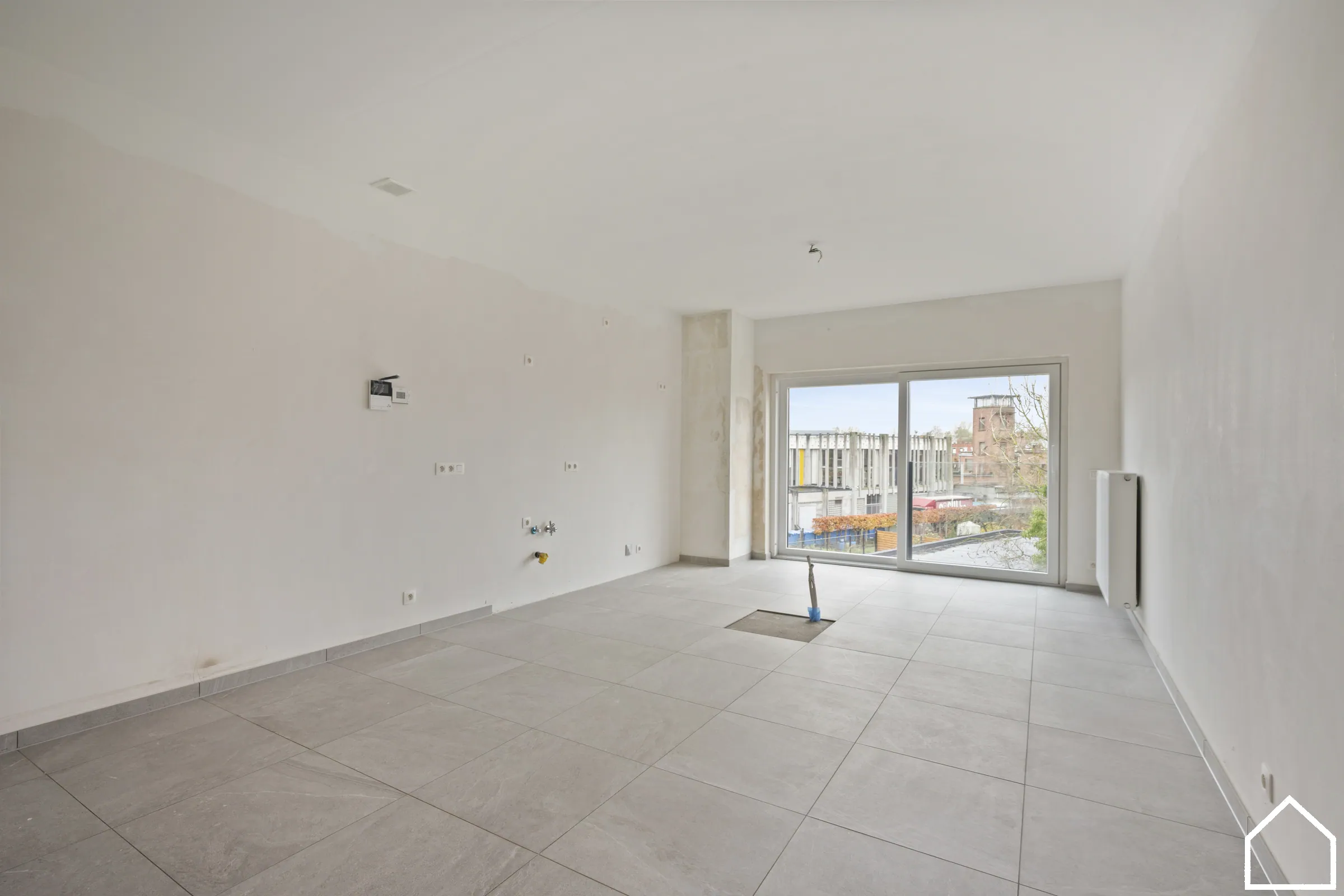 Appartement op de 2de verdieping (90m²) bestaande uit een inkomhal met vestiaire en toilet, een doucheruimte met lavabomeubel, een wasruimte, 2 slaapkamers, een ruime woonkamer met veel lichtinval en een ingerichte keuken, een terras van 11 m ².