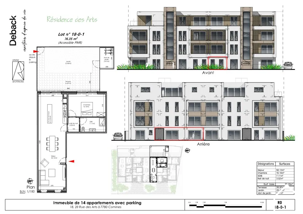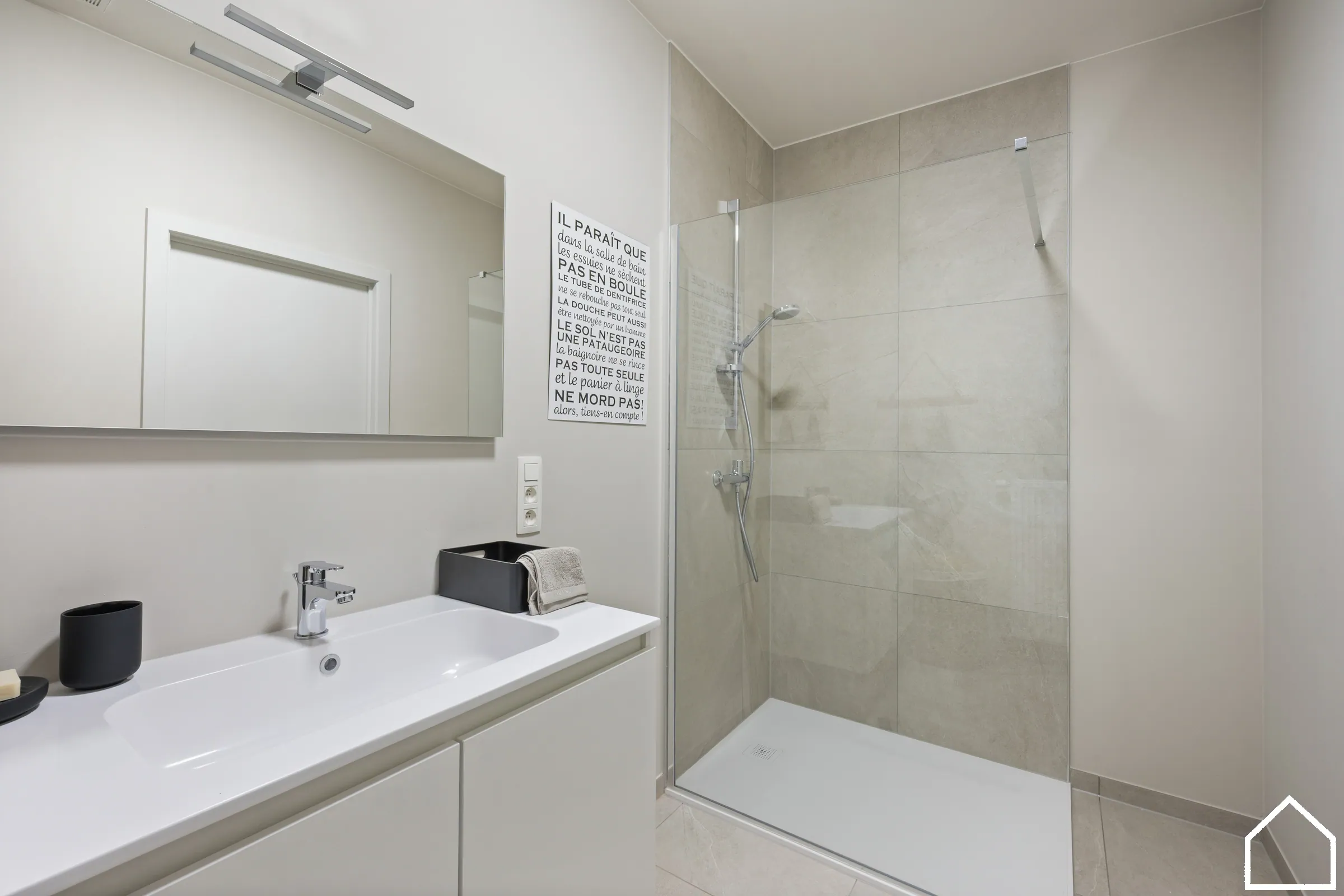 Appartement op de begane grond (77m²) bestaande uit een ruime lichte woonkamer met ingerichte keuken met ruimte voor wasmachine, 1 slaapkamer, kleine wasruimte, douchekamer met wastafel en toilet, achterterras van 26 m² met uitzicht op een kleine tuin van 25 m² met afdak en toegang tot de parkeerplaats.