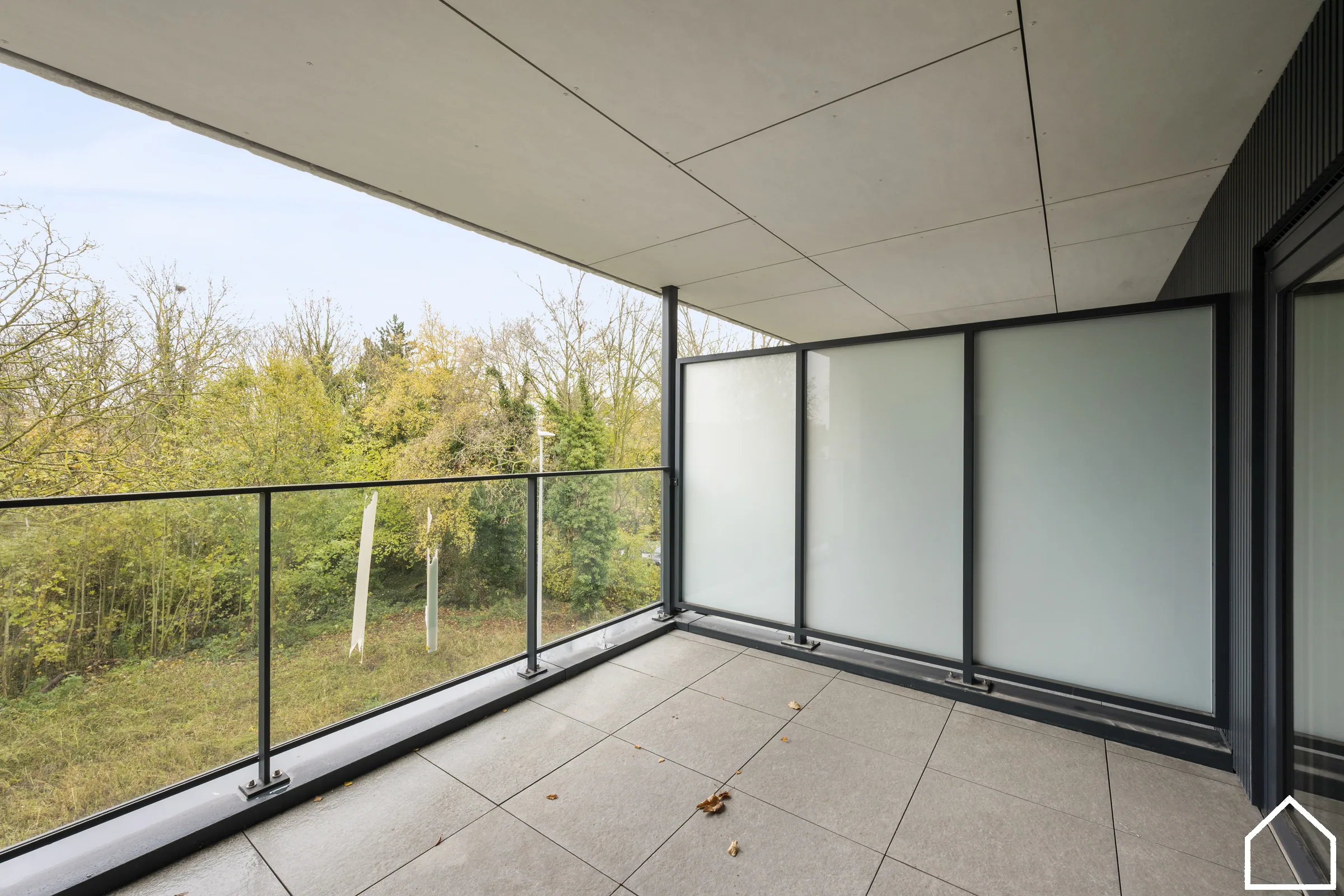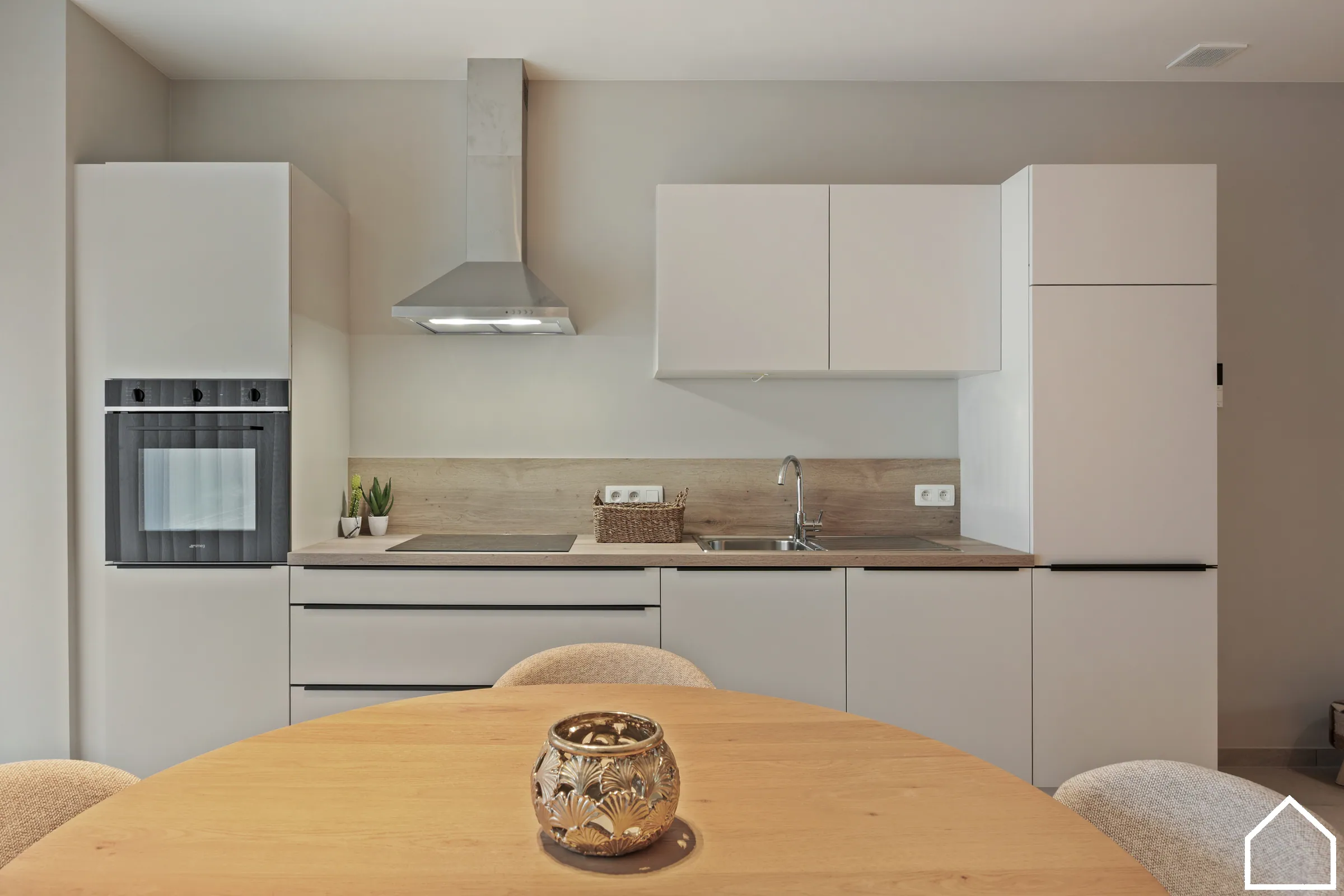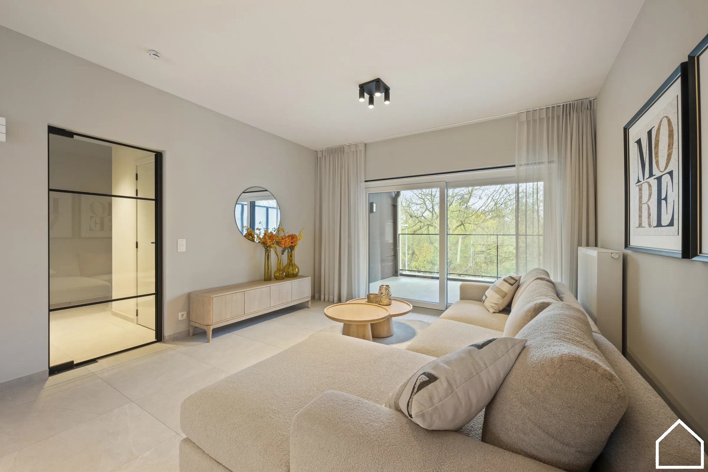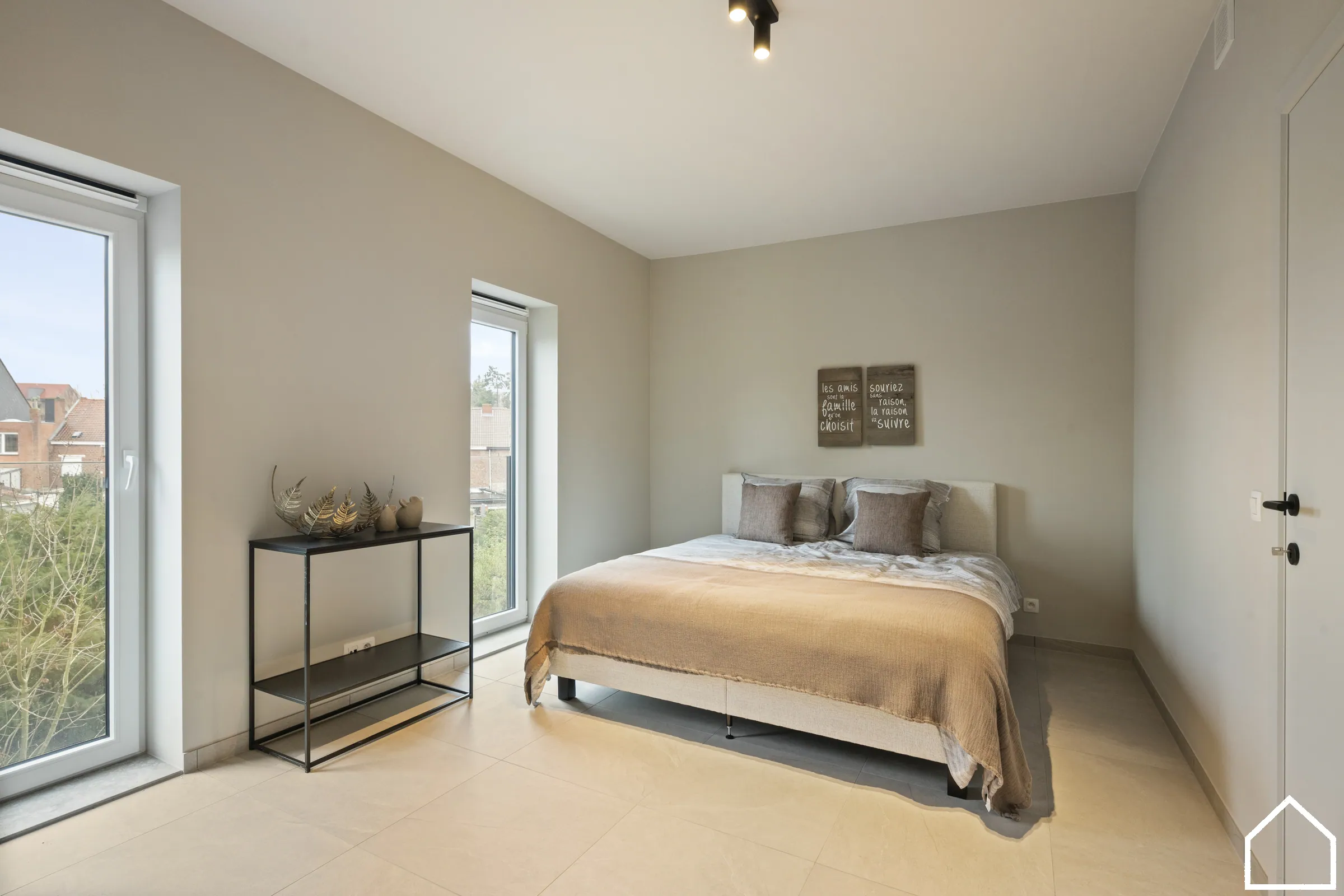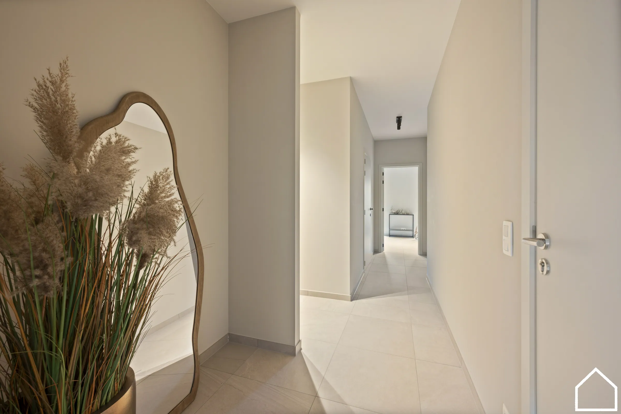 Appartement op de 2de verdieping (90m²) bestaande uit een inkomhal met vestiaire en toilet, een doucheruimte met lavabomeubel, een wasruimte, 2 slaapkamers, een ruime woonkamer met veel lichtinval en een ingerichte keuken, een terras van 11 m ².