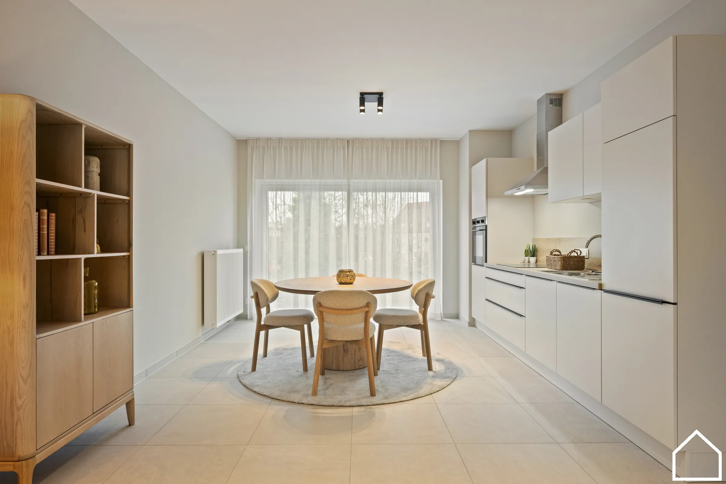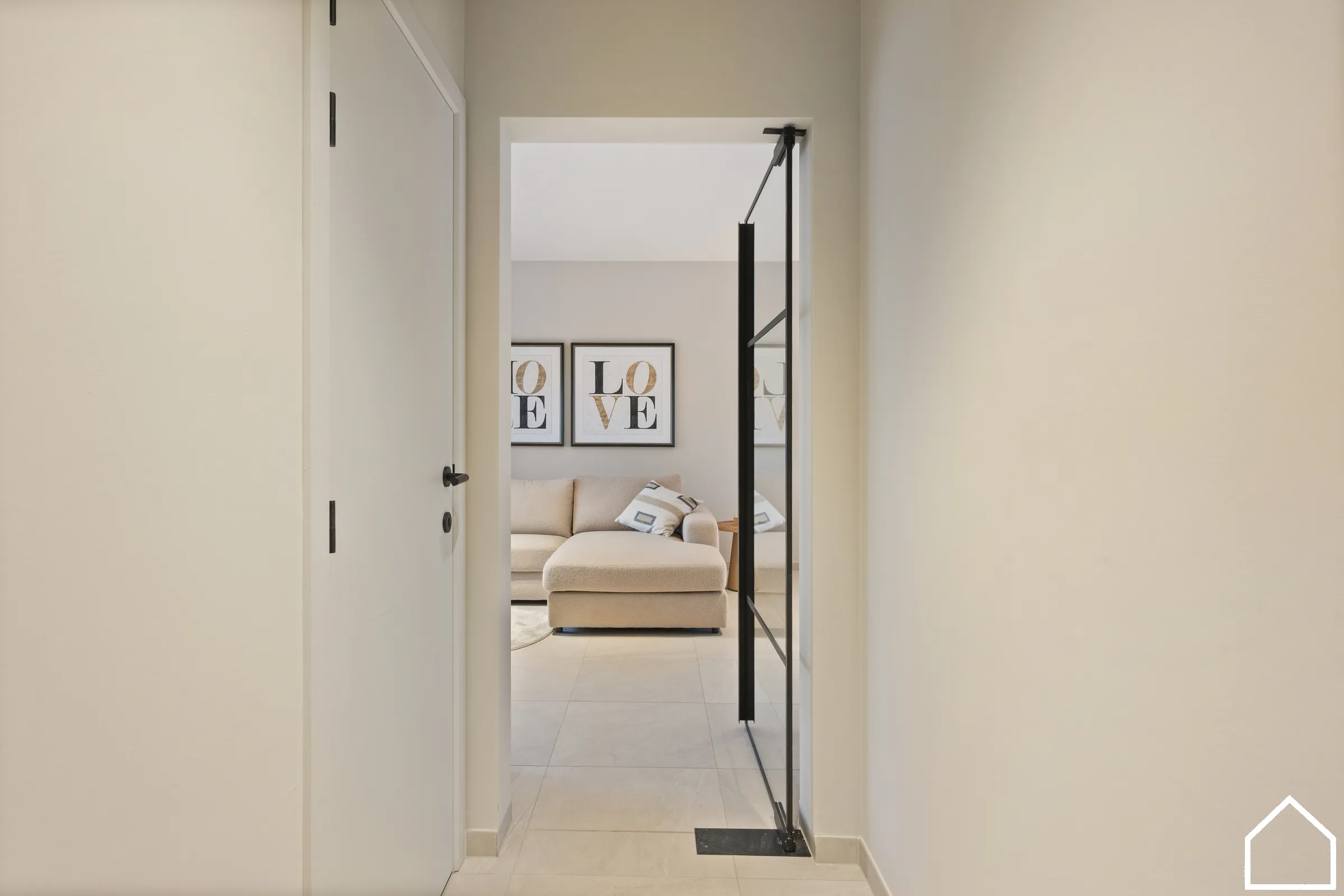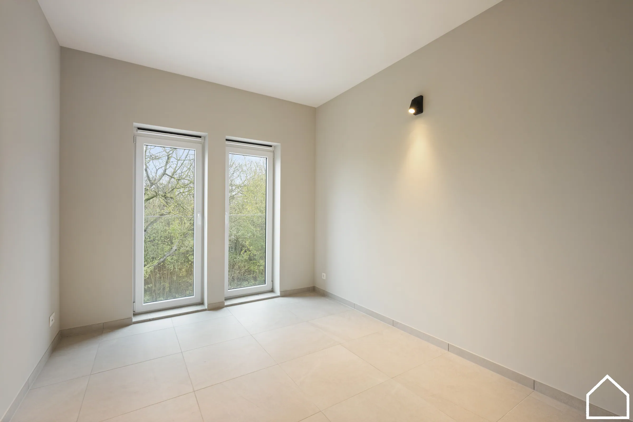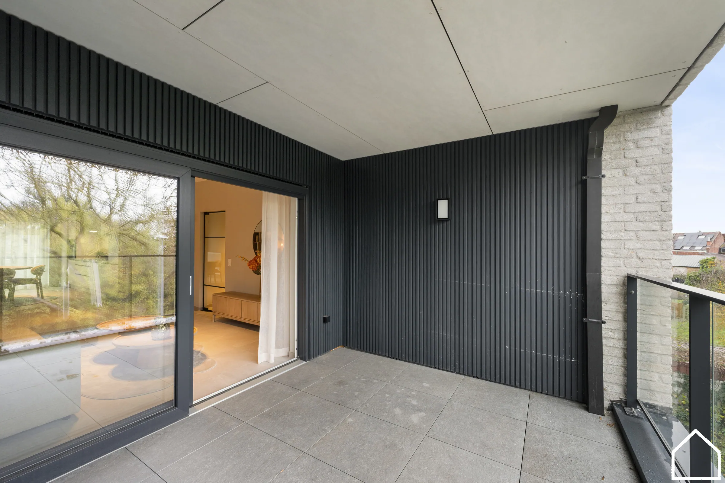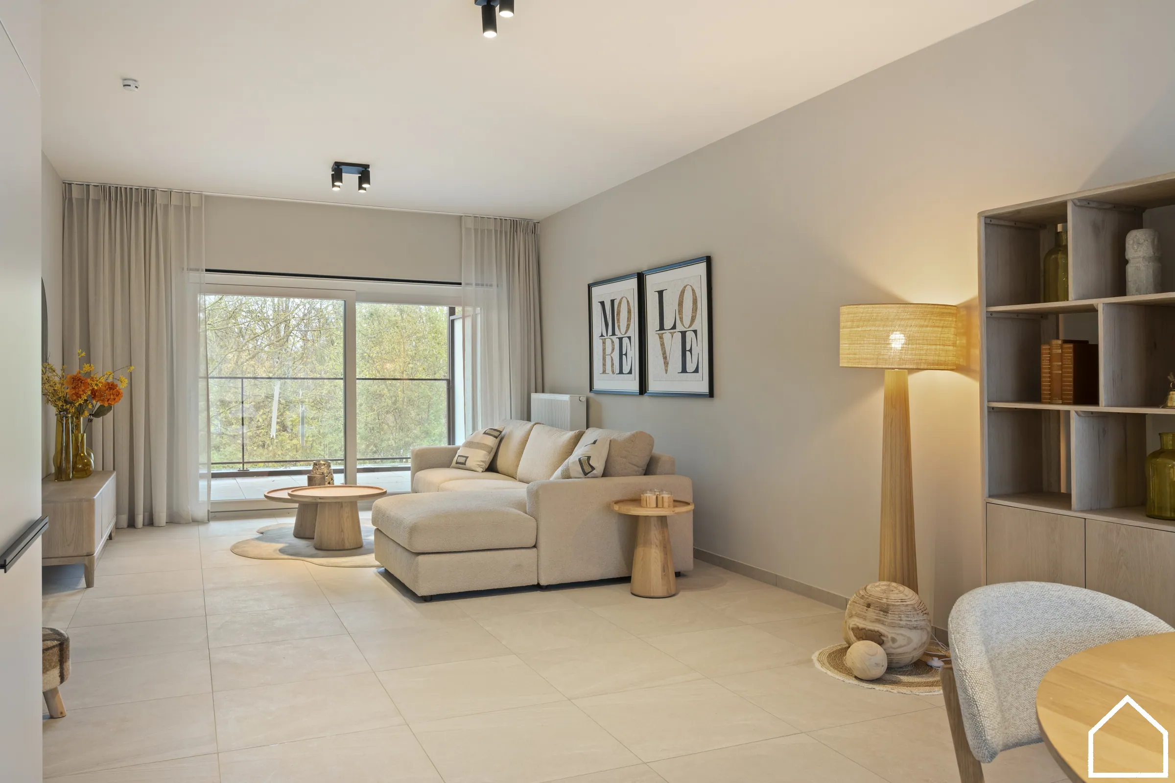 Appartement op de 2de verdieping (90m²) bestaande uit een inkomhal met vestiaire en toilet, een doucheruimte met lavabomeubel, een wasruimte, 2 slaapkamers, een ruime woonkamer met veel lichtinval en een ingerichte keuken, een terras van 11 m ².