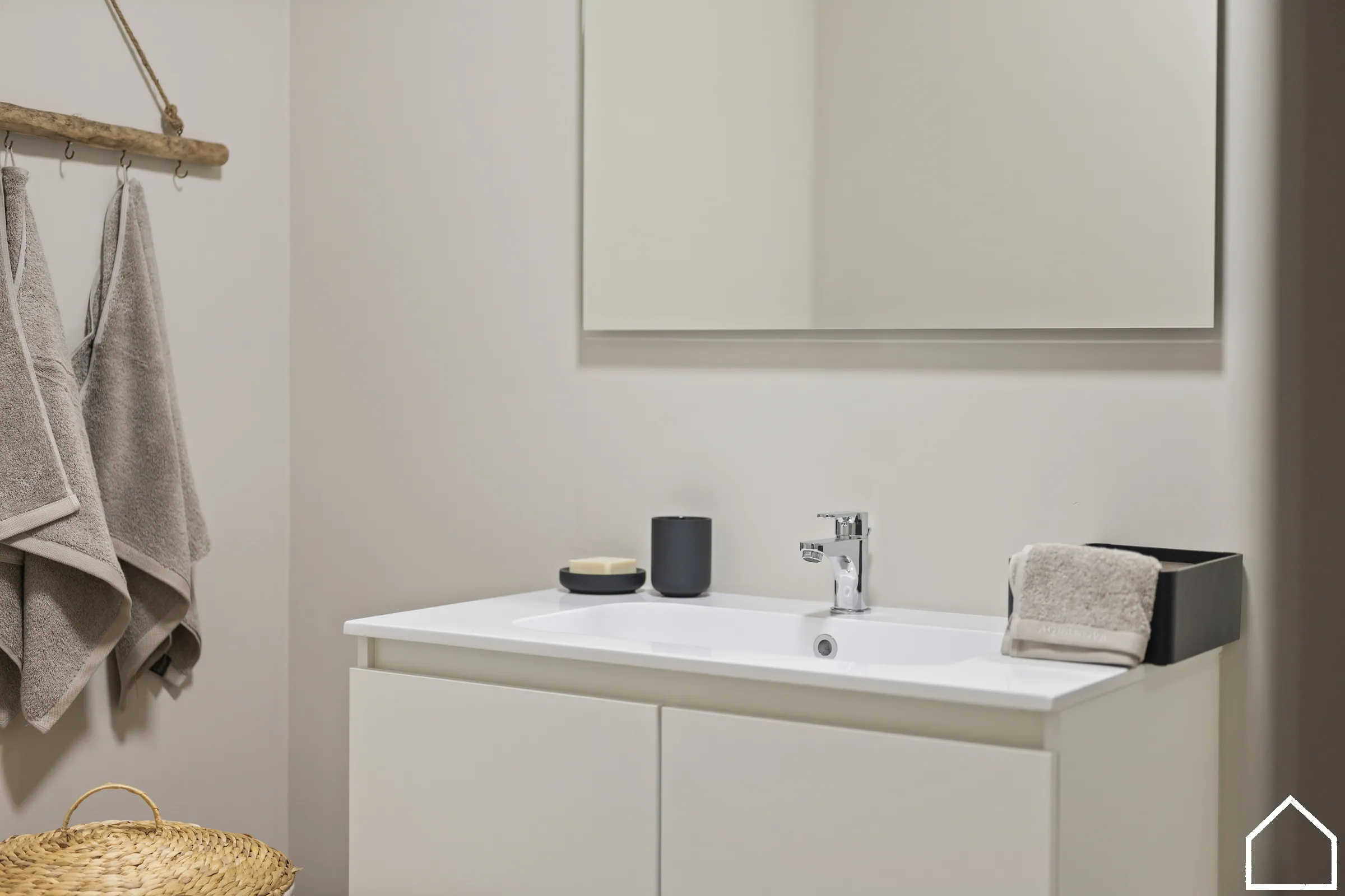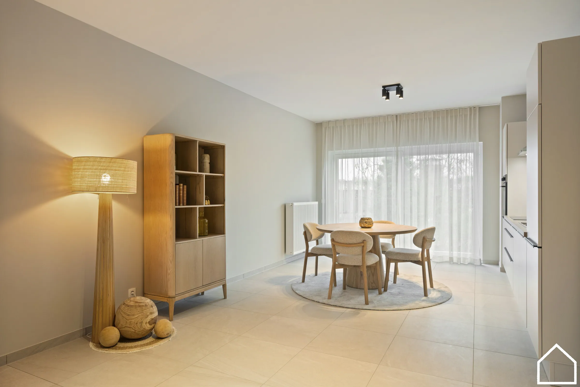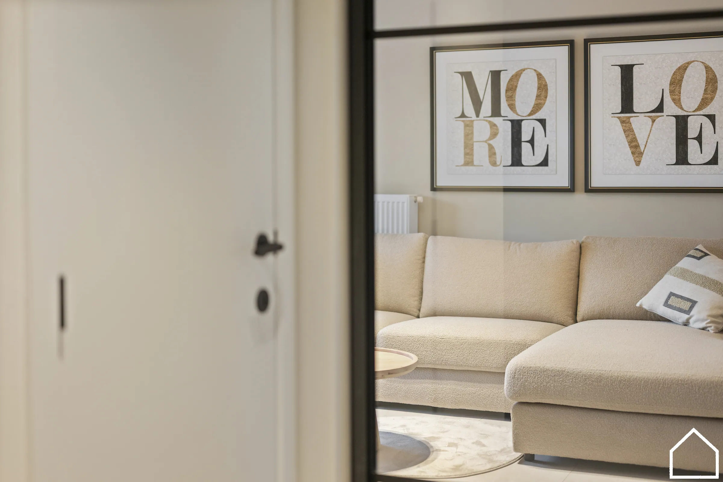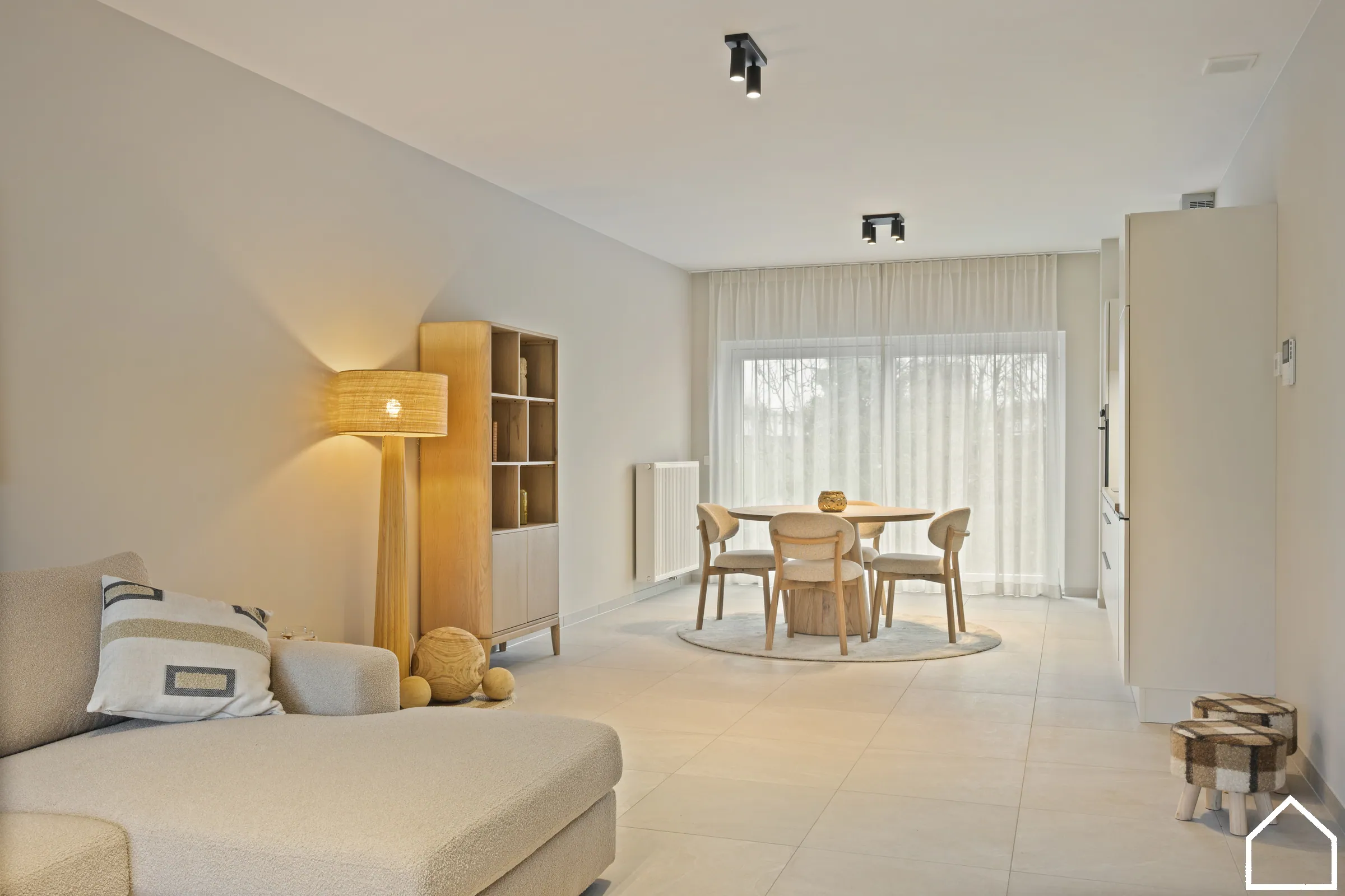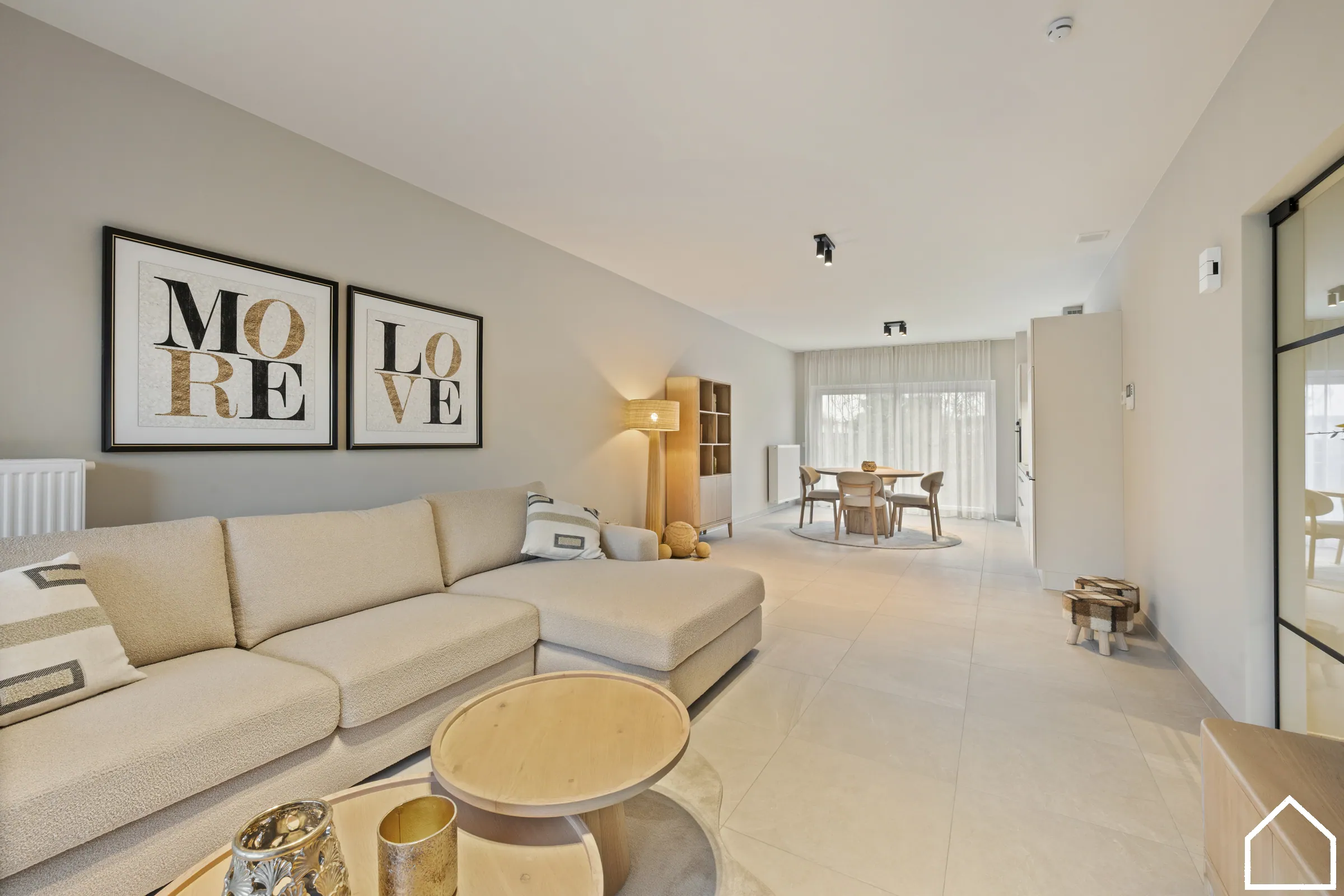 Appartement op de 2de verdieping (90m²) bestaande uit een inkomhal met vestiaire en toilet, een doucheruimte met lavabomeubel, een wasruimte, 2 slaapkamers, een ruime woonkamer met veel lichtinval en een ingerichte keuken, een terras van 11 m ².