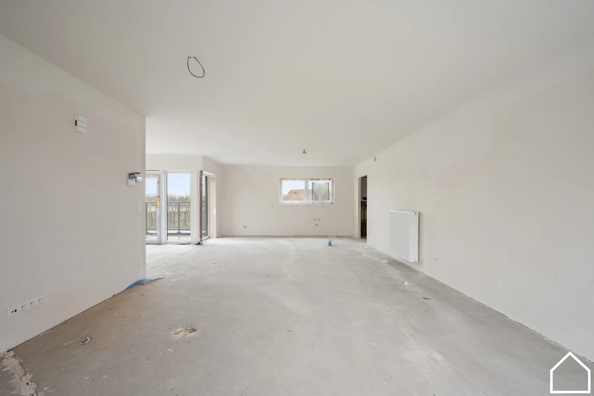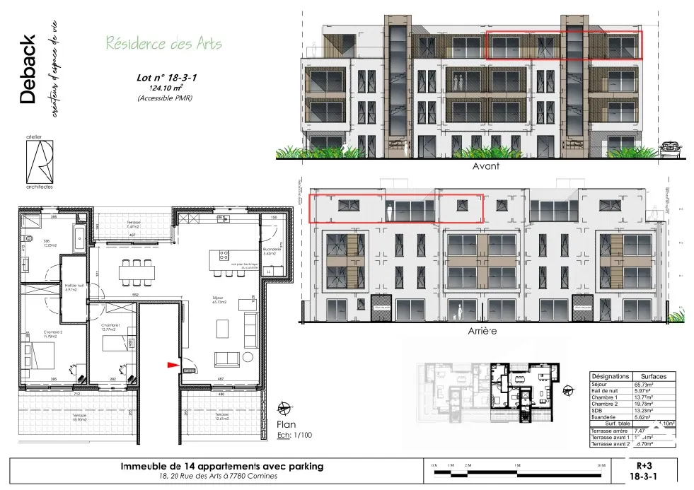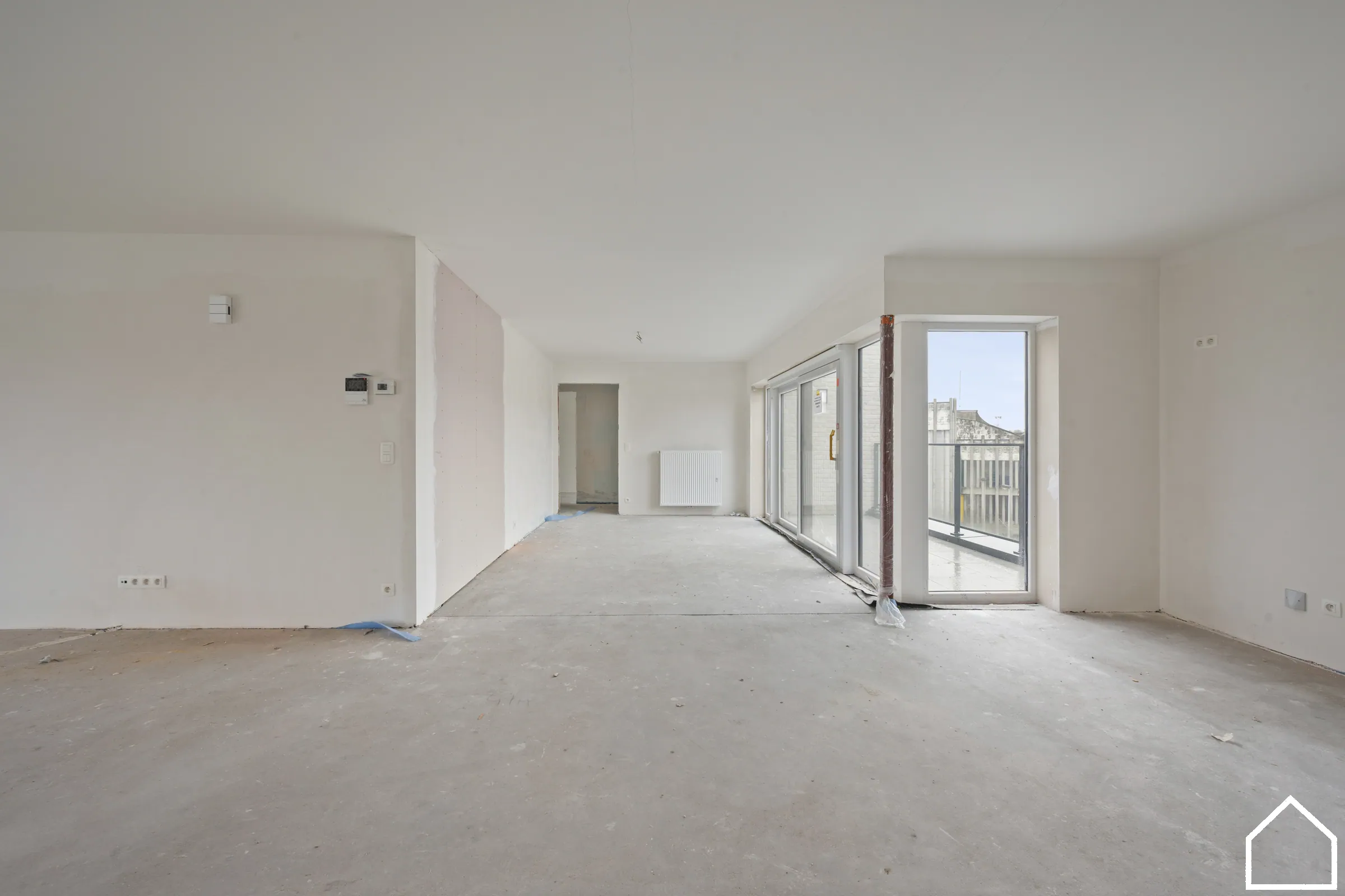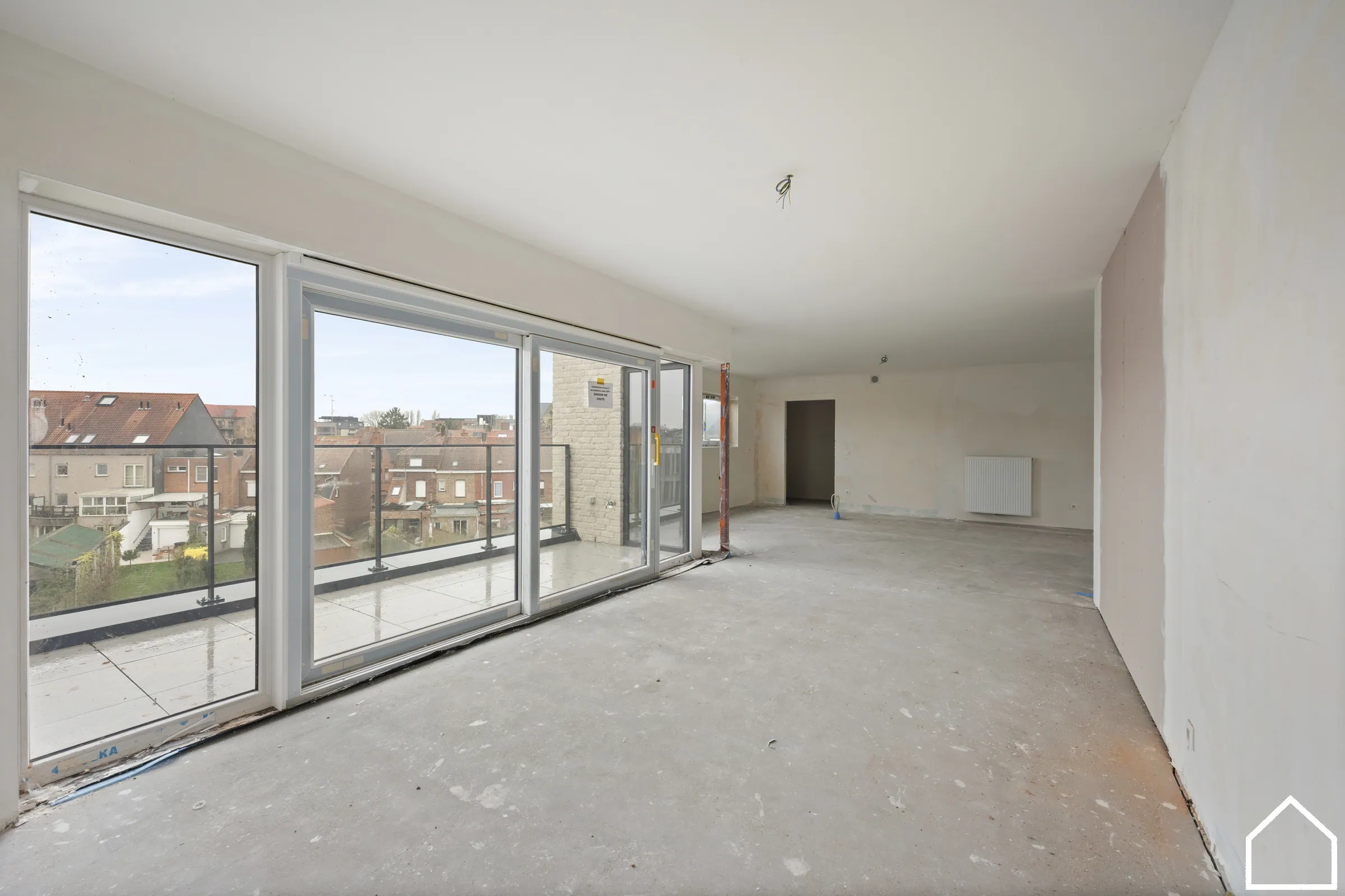 Penthouse op de 3de verdieping (126m²) van een blok met 7 appartementen. Dit appartementen bestaat uit een ruime living met veel lichtinval, een uitgeruste keuken, een berging en een nachthal met toegang tot de badkamer (met bad, douche, lavabomeubel en WC) alsook tot twee slaapkamers met een gezamenlijk terras van 18 m² op het oosten. Verder zijn nog twee andere terrassen toegankelijk via de leefruimte (12 m² op het oosten en 7 m² op het westen).