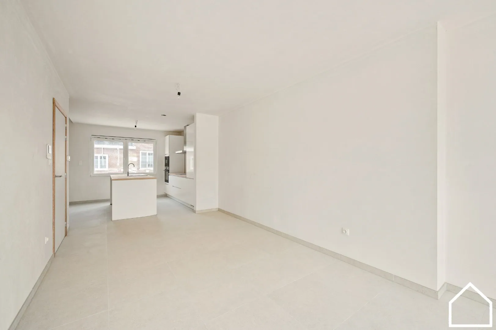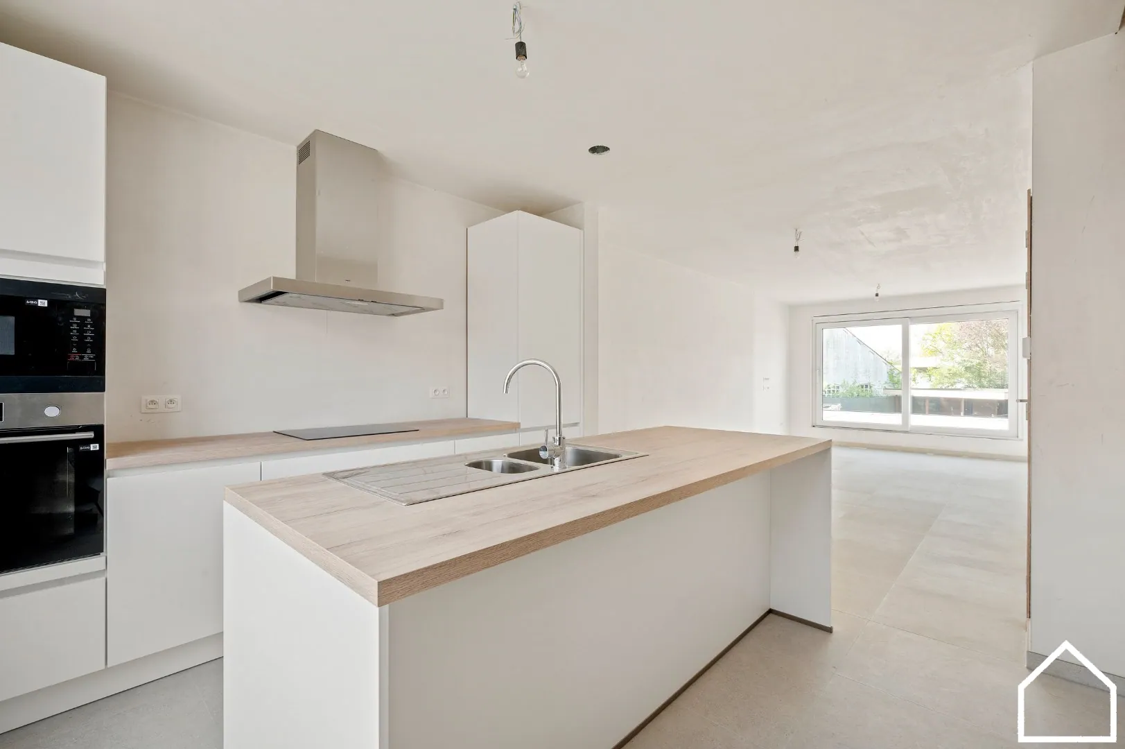 GLV: open lichtrijke leefruimte met keuken en kookeiland, vaatwas, frigo, inductiekookplaat, microgolfoven en heteluchtoven - berging - terras