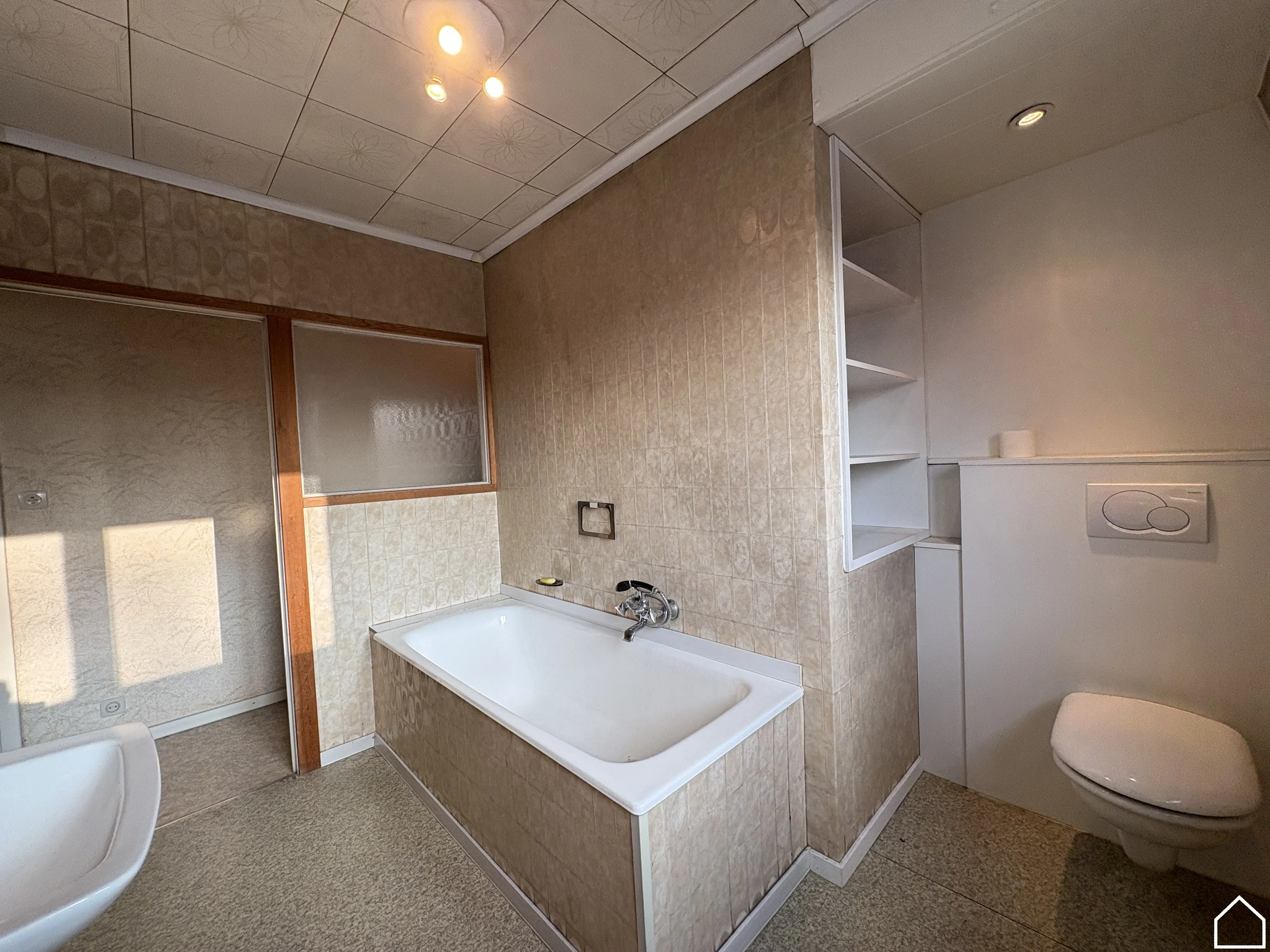 Op de eerste verdieping zijn er drie aangename slaapkamers (16,4 m² – 15,8 m² – 13,7 m²) en een badkamer met bad, wastafel en toilet (6,6 m²).