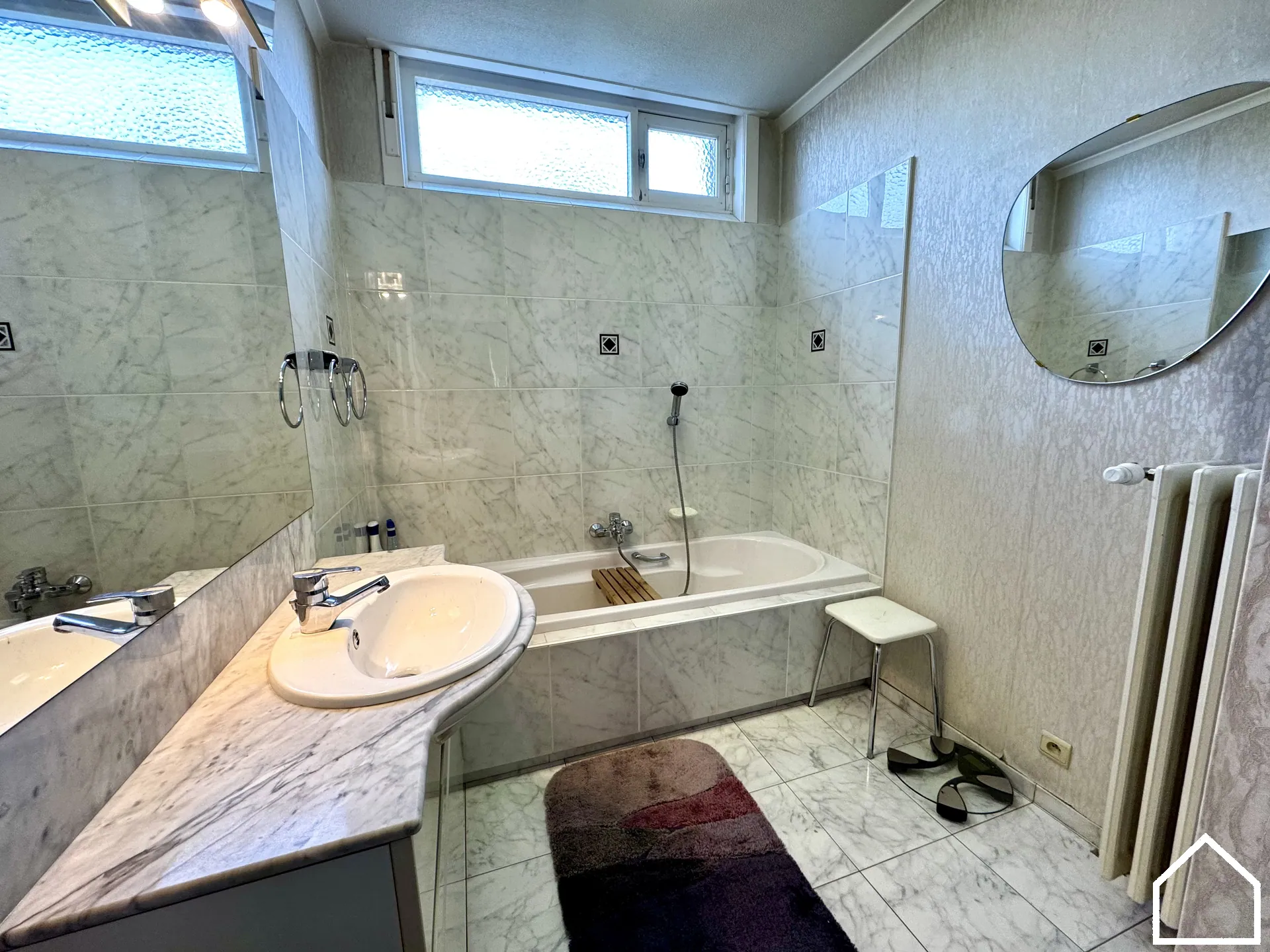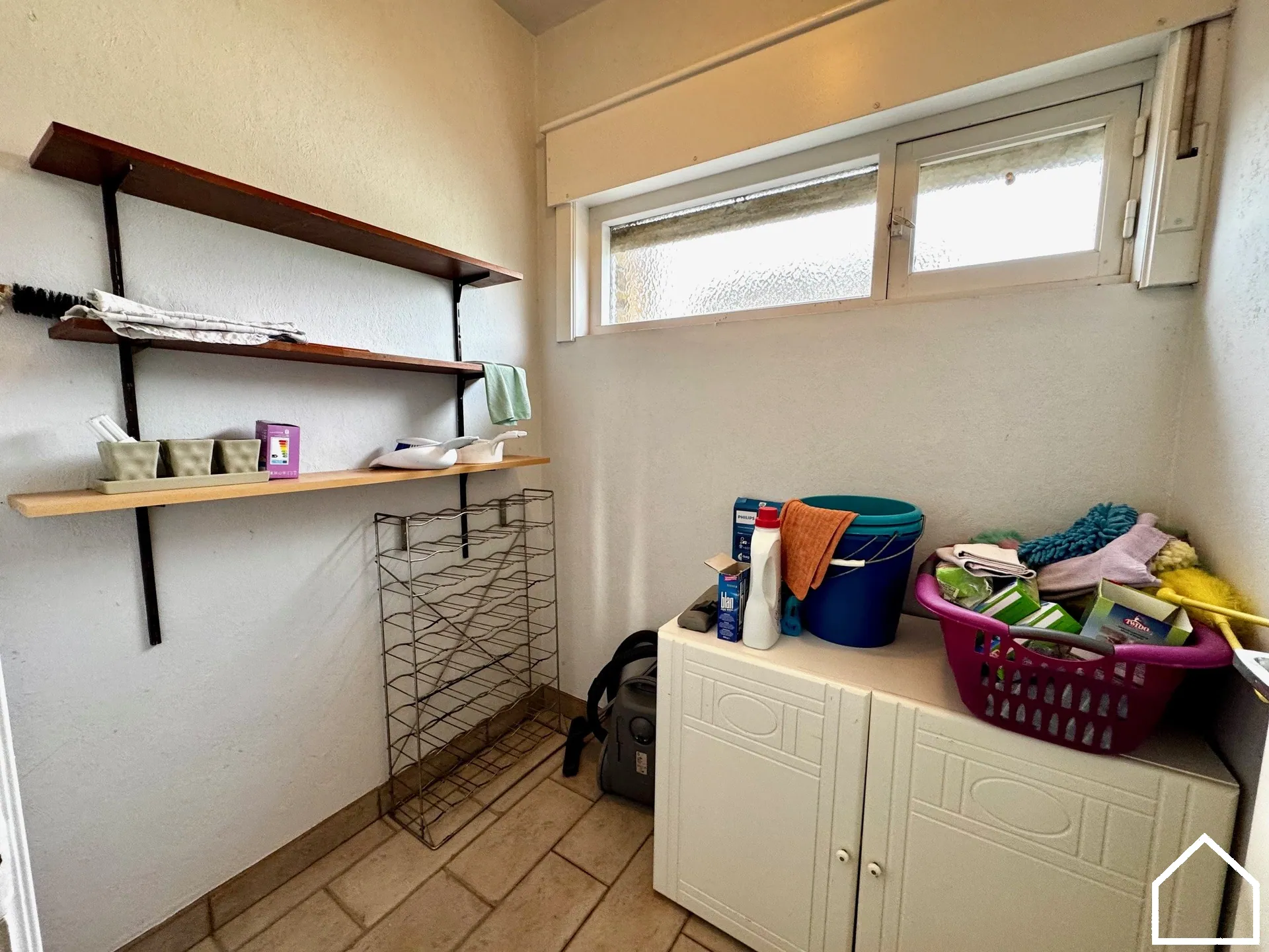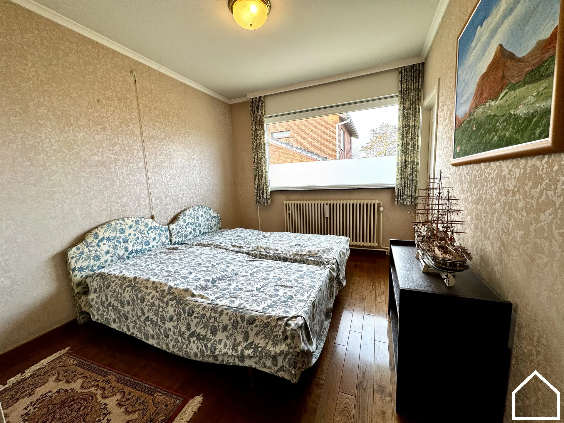 De inkomhal biedt eveneens toegang tot twee ruime slaapkamers, een derde kamer die kan ingericht worden als bureau, kinderkamer of hobbyruimte. Vanuit deze derde kamer bereikt u nog een bijkomende berging met aansluitend de garage. Verder vindt u via de inkomhal de badkamer, uitgerust met een douchebad en lavabomeubel, evenals een apart toilet.