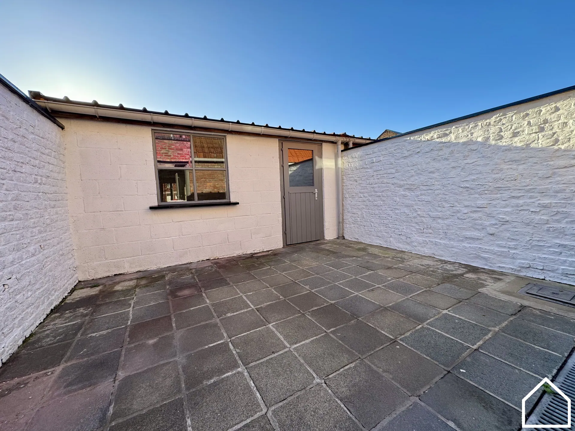 GLV: inkomhal (4,31 m²) - leefruimte van (14,7 m²) - keuken (9 m²) uitgerust met een inox spoelbak en een gasfornuis - badkamer (6,8 m²) met toilet, douchecel en een enkel wasmeubel - koertje (8 m²) - tuinhuis met garagepoort van (9,8 m²)