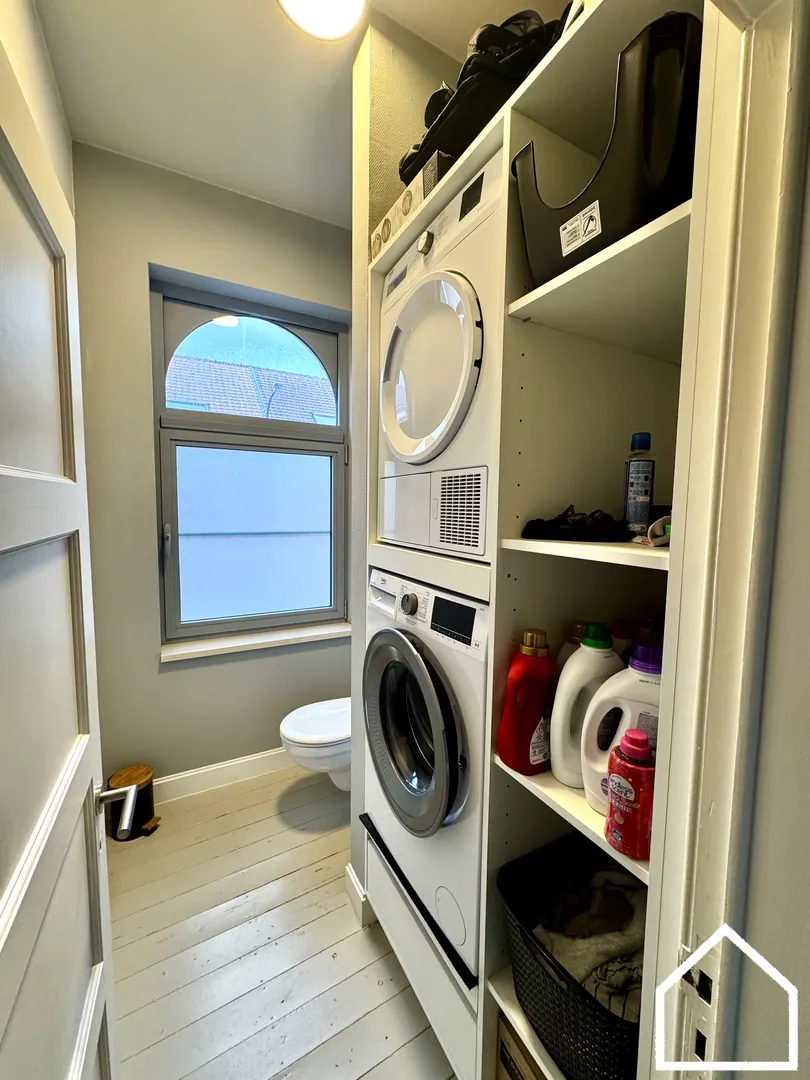Twee ruime slaapkamers (12,80 m² en 12,20 m²) – apart toilet – praktische inbouwkast met aansluiting voor wasmachine en droogkast (3,70 m²).