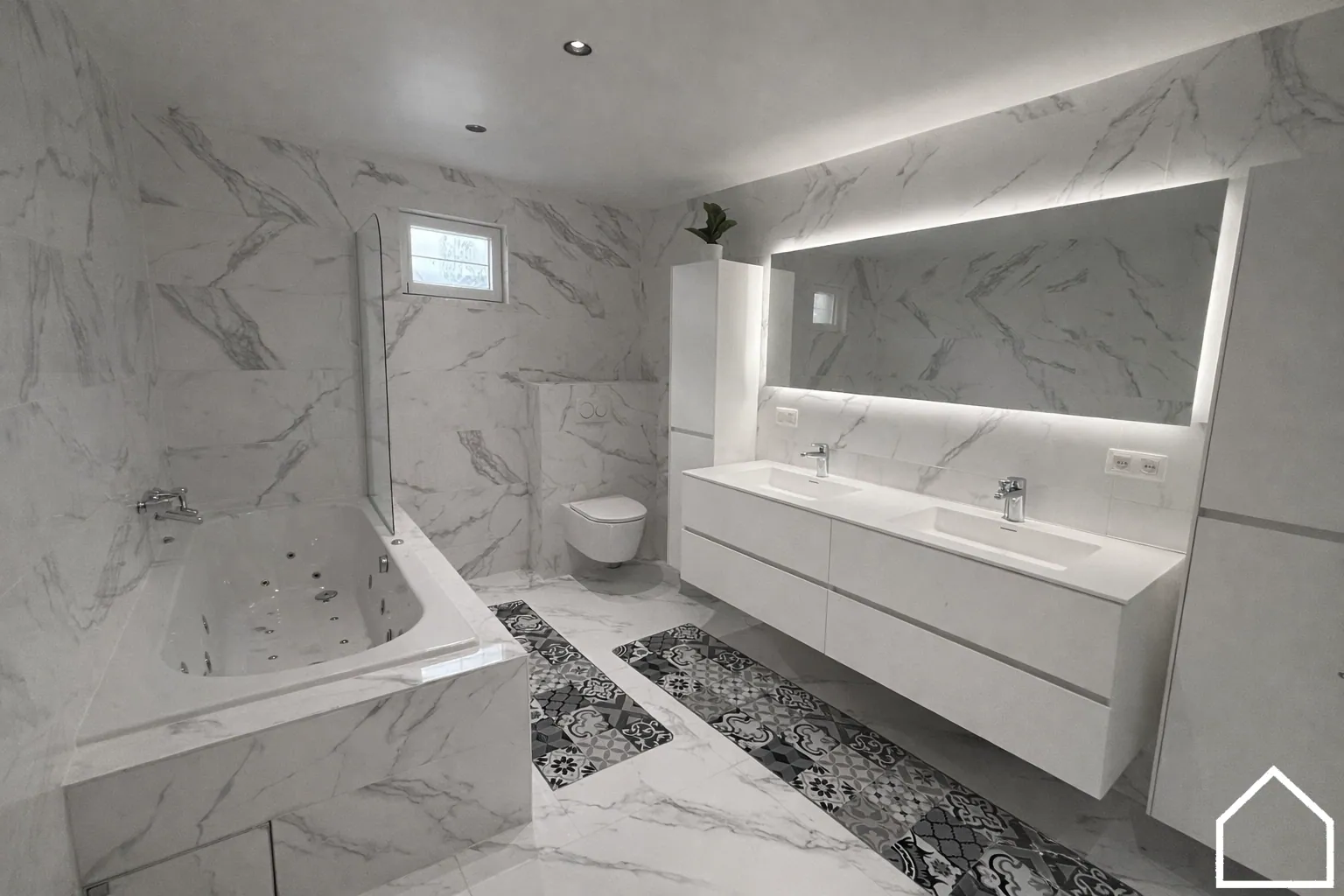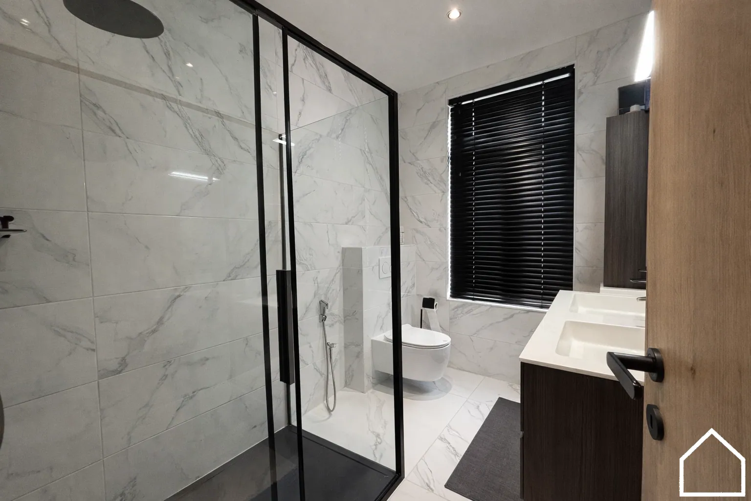 Op de eerste verdieping bevinden zich twee ruime slaapkamers en een moderne tweede badkamer met inloopdouche, dubbel lavabomeubel en tweede toilet.
