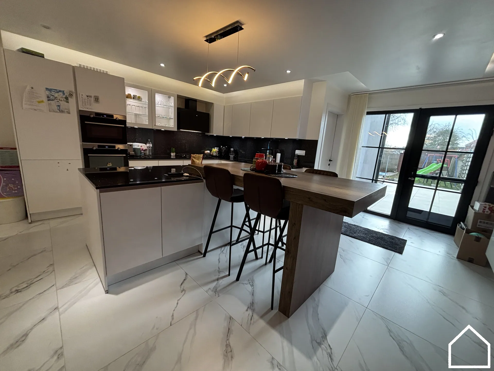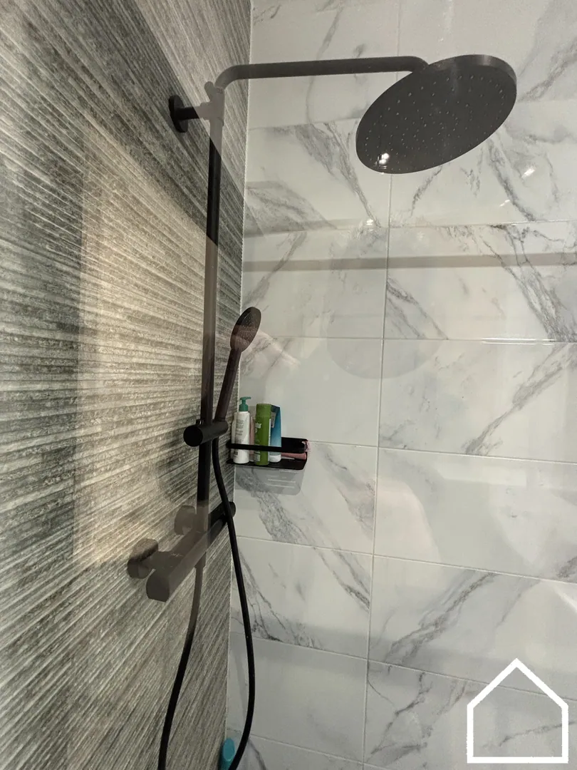 Op het gelijkvloers vindt u een ruime badkamer uitgerust met bubbelbad, dubbel lavabomeubel en toilet. De ingerichte keuken biedt directe toegang tot de zonnige, zuidgerichte stadstuin met aangenaam terras – een heerlijke plek om te genieten.