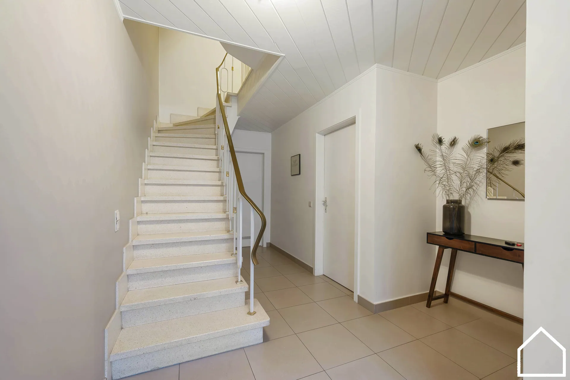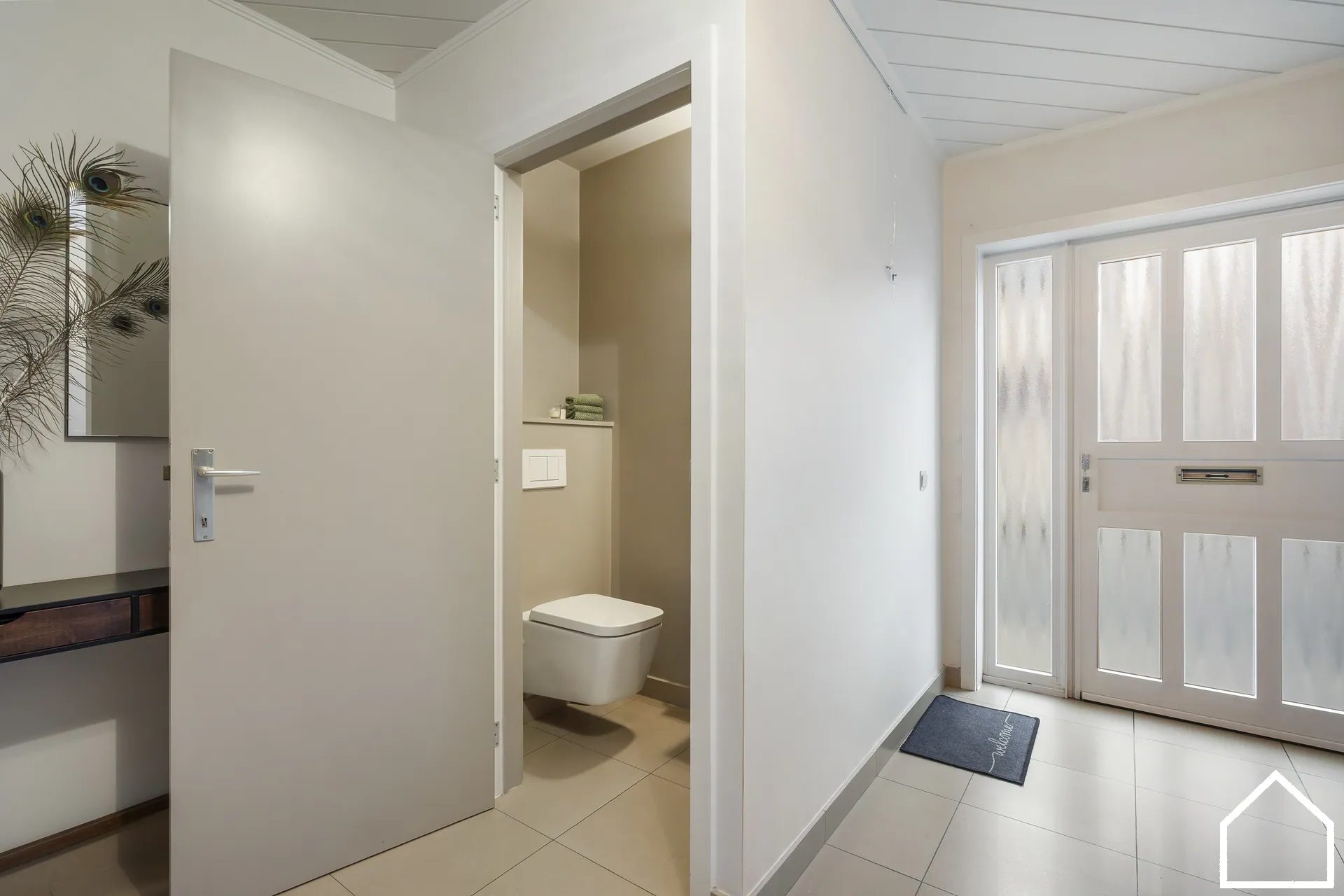 inkomhal (14,3m²) met apart toilet en handwasbakje - berging (6,2m²) - garage met automatische sectionale poort en rechtstreekse toegang tot de tuin (34m²) - bureau (9,7m²) - terras (30m²) - tuin (160m²)