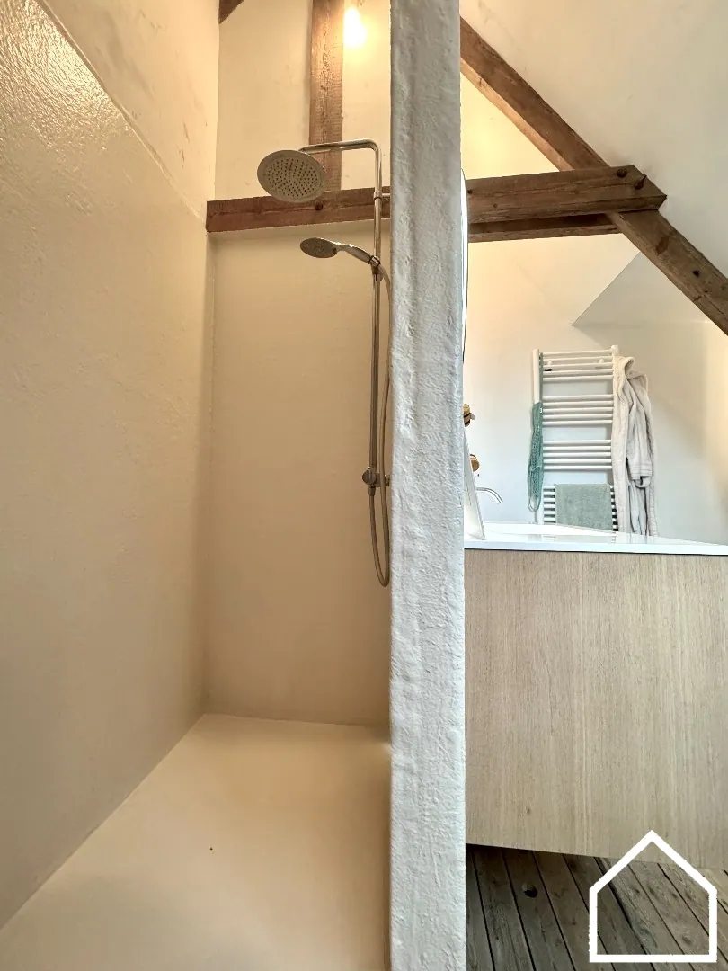 Verdieping +1: 3 slaapkamers (13.50m² - 12m² - 9.50m²) - badkamer met inloopdouche, lavabo-meubel, toilet, handdoekdroger en mogelijkheid tot bad (8m²)