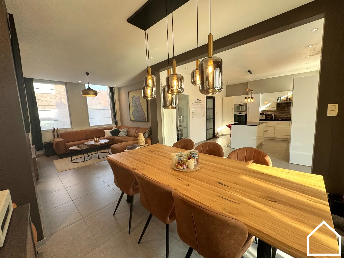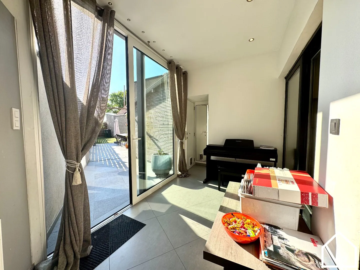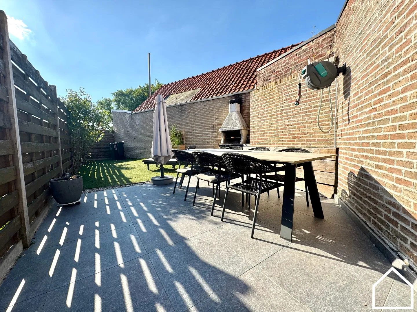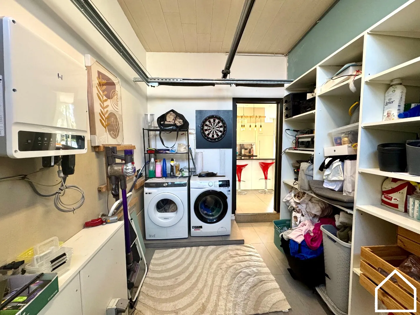 GLV: inkomhal (3,28m²) - leefruimte met gascasette en open keuken bestaande uit een keukeneiland, vaatwas, frigo, gasbekken, oven en microgolfoven (57m²) - garage/wasberging (8,88m²) - apart toilet - technische berging (1,49m²) - tuin met terras en buitenbarbecue (....m²)