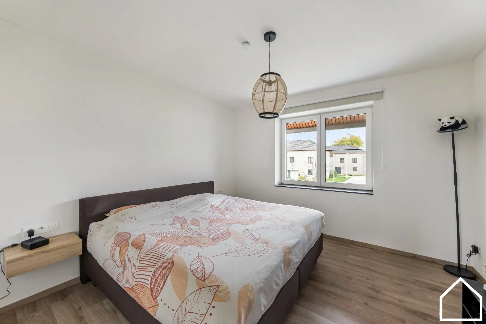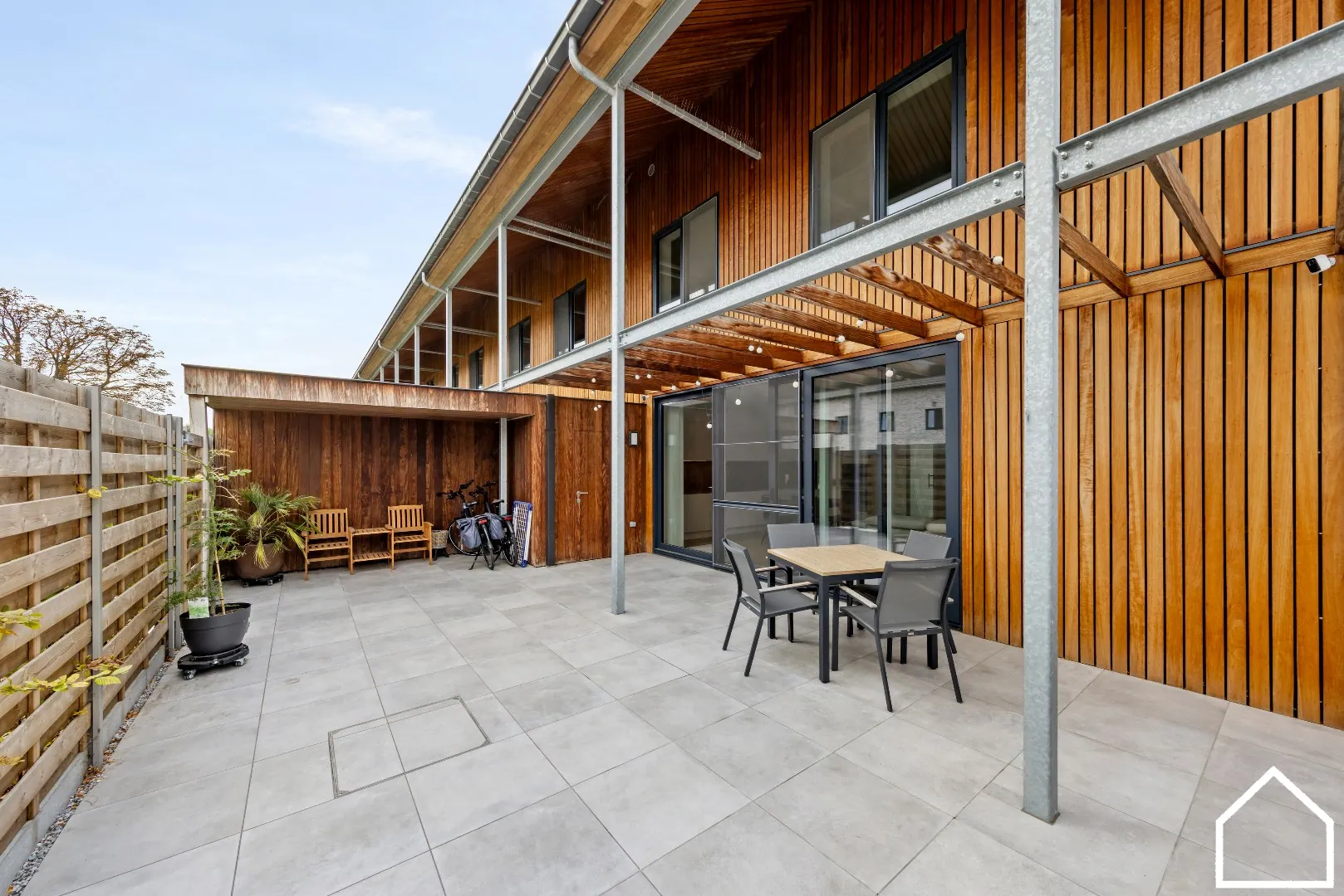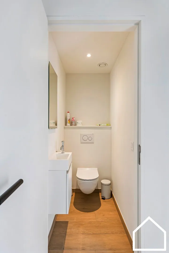 GLV: inkomahal (5,10m²) - berging (3m²) - apart toilet met handwasbakje - bureau/gelijkvloerse slaapkamer (9m²) - open kook- en leefruimte (38m²) met een uitgeruste keuken bestaande uit een vaatwas, frigo, inductiekookplaat, hetelucht- en microgolfoven, inductiekookplaat en een ingewerkte spoelbak - terras (32m²) - tuinberging (2,5m²) + aparte autostandplaats