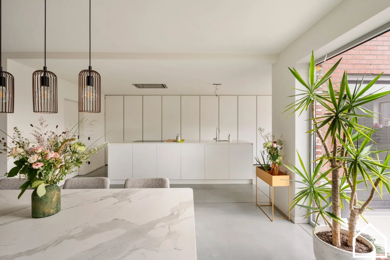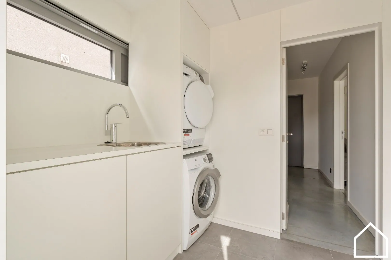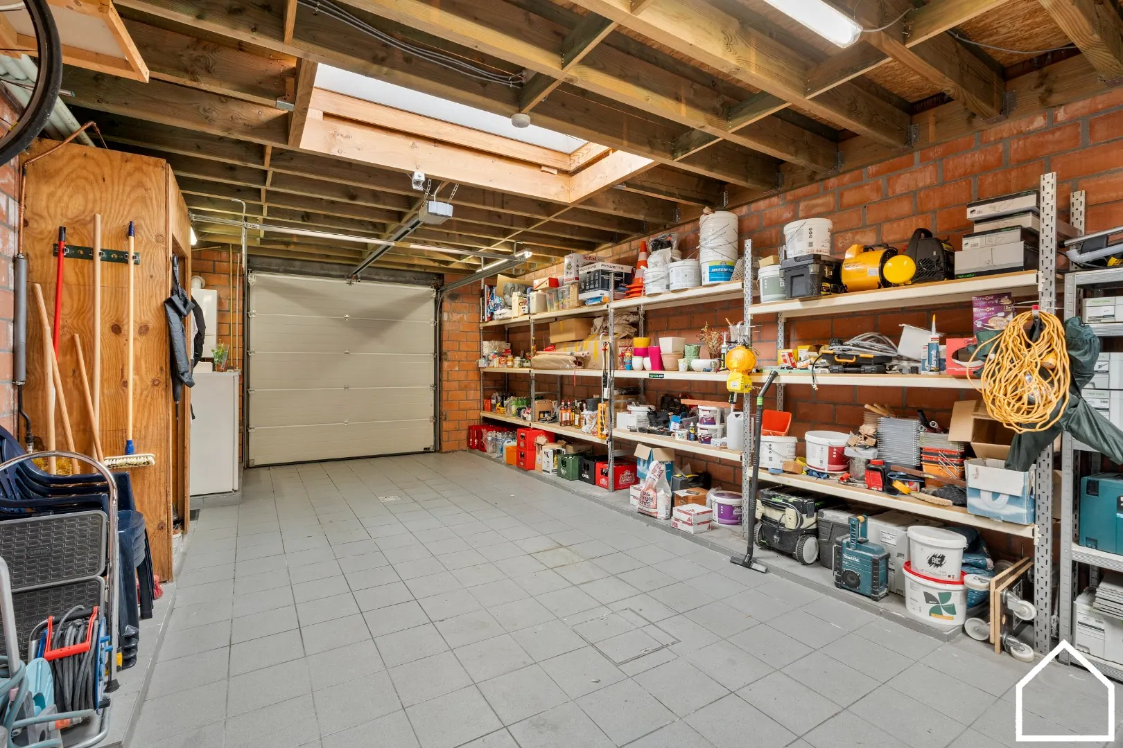 Oprit (25m²) met poort (rechtstreekse toegang tuin) - inkom (6,52m²) met apart toilet - open leefruimte (31,8m²) - uitgeruste open keuken met kookeiland en inbouwkasten, inductiekookplaat, oven, ingebouwde frigo, vaatwasser, ingebouwde gootsteen (33,7m²) met eetplaats - bureauruimte (15,68m²) - garage met automatische sectionale poort (57,78m²) (4,62m breed op 12,5m diep) - wasberging met maatkasten en wasbak (5,7m²) - terras (50m²) - tuin (170m²)