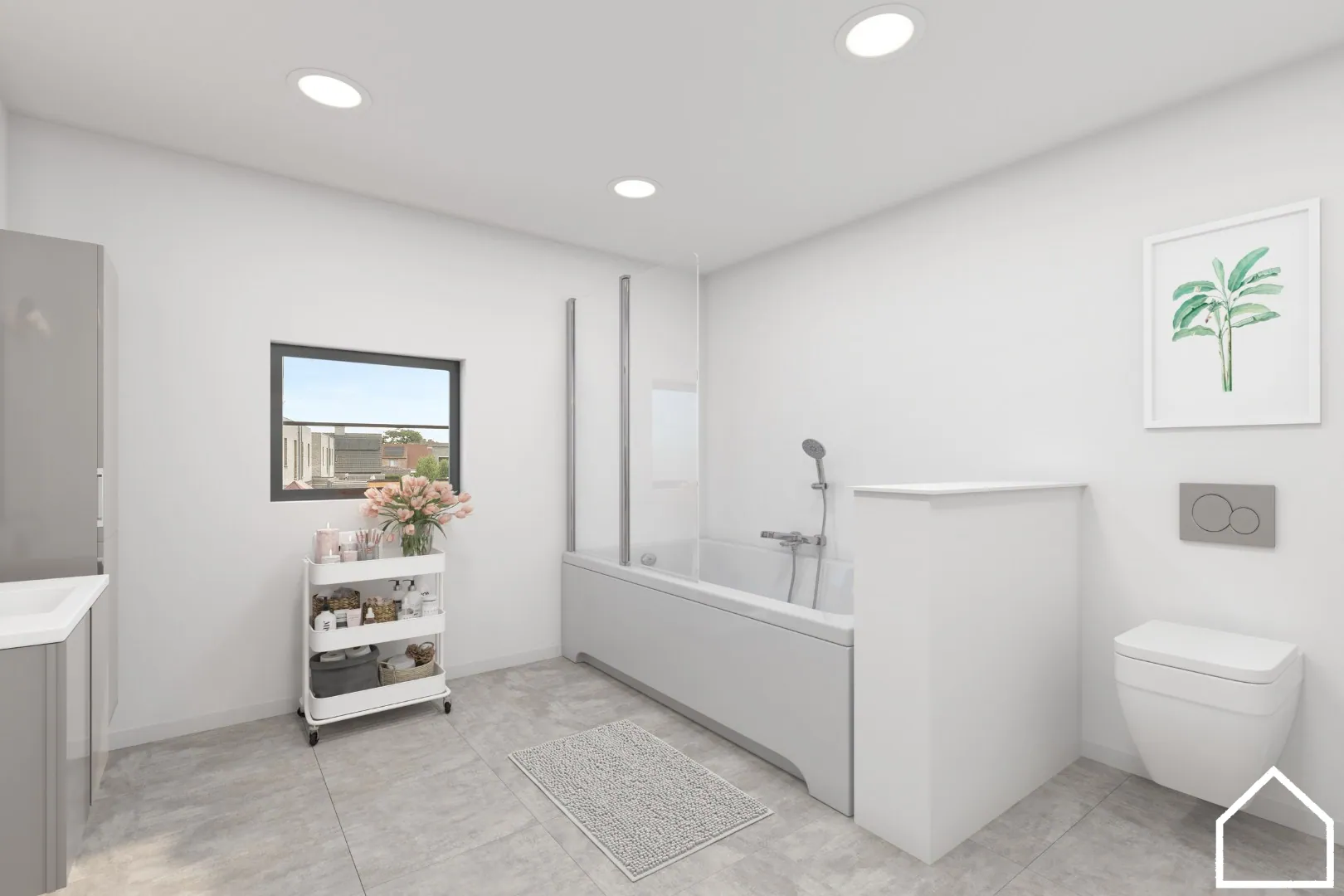 Berging (5m²) - nachthal - 3 slaapkamers (16,17m ² - 15,77m² - 15,46m²) - badkamer met dubbel wasmeubel, douchebad en toilet (12,2m²)