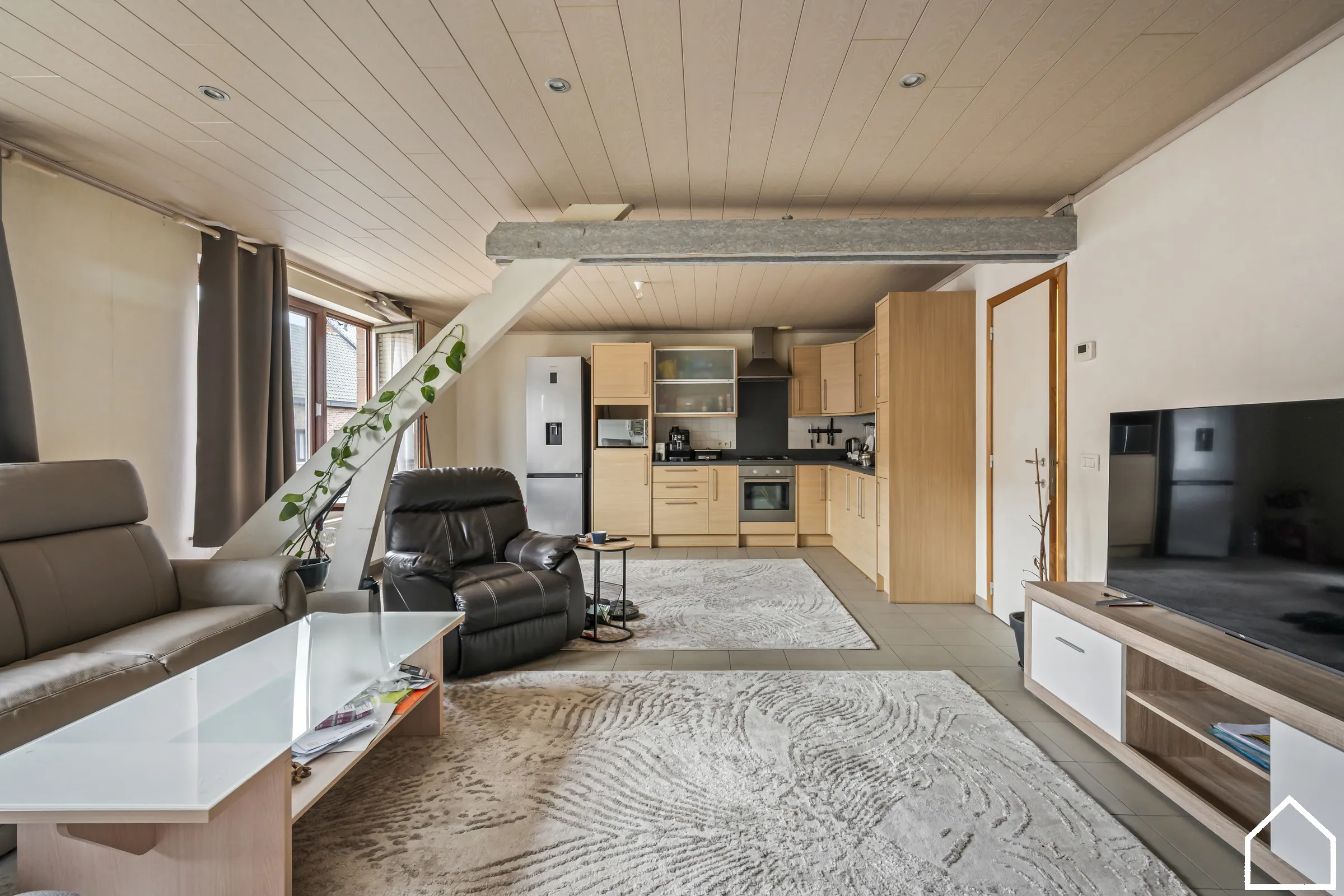 leefruimte met ingebouwde keuken: ingebouwde frigo, gasfornuis, heteluchtoven (34,5m²) - nachthal (1m x 6,60m) - slaapkamer 1 (11m²) - slaapkamer 2 (8,5m²) - badkamer met ingebouwd ligbad, enkel wasmeubel en douchecel (6,4m²) - apart toilet - zolder